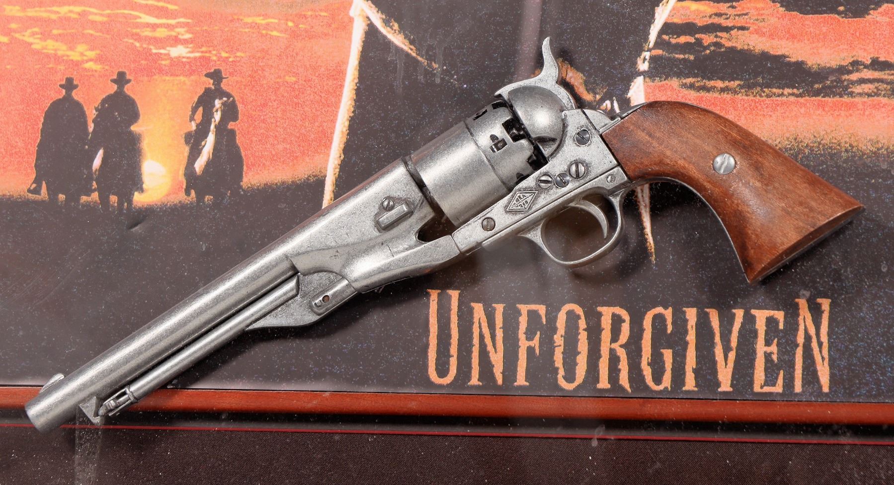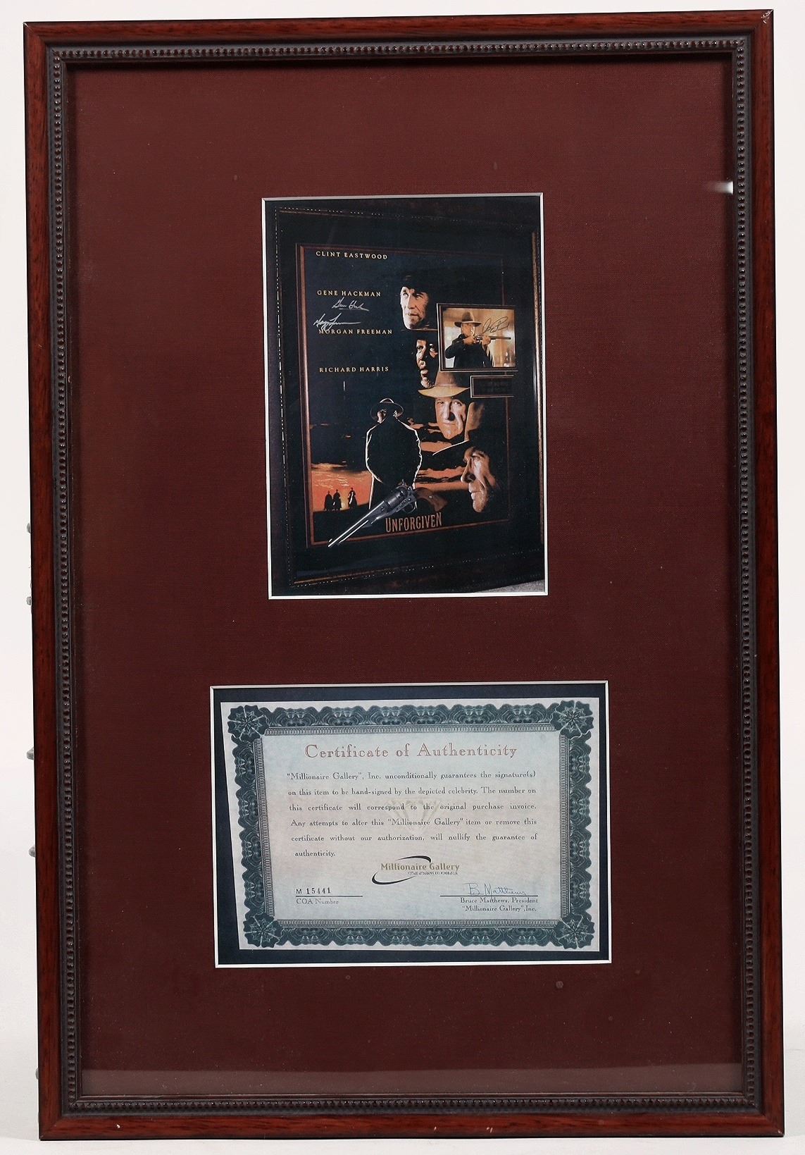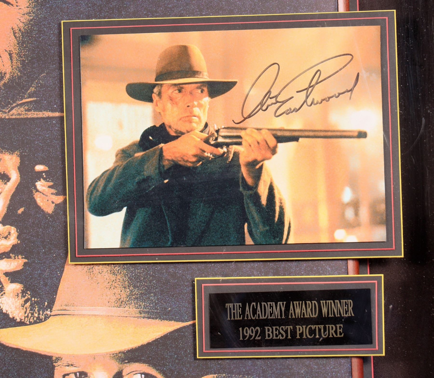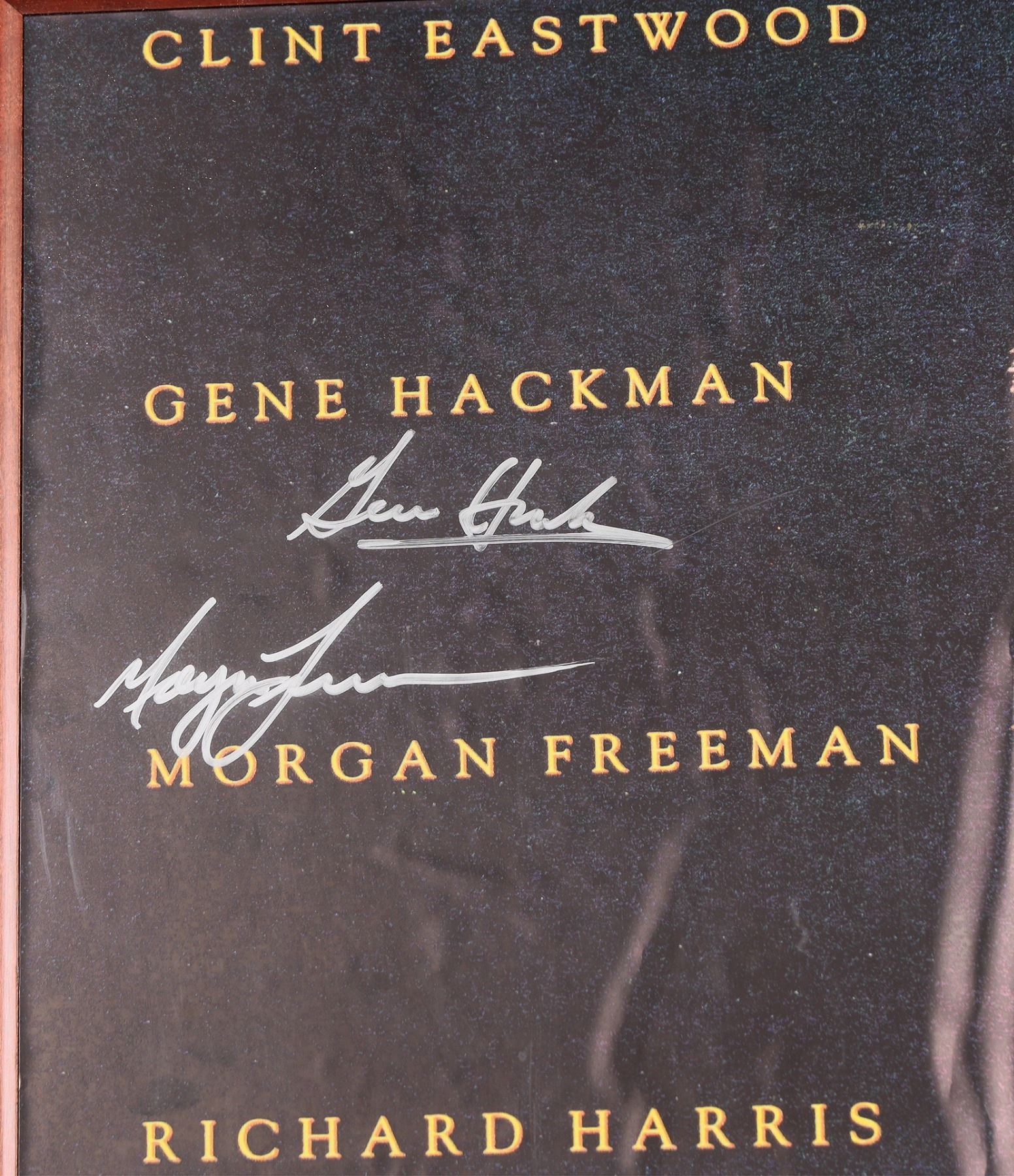 Autographed one sheet shadow box for the Best Picture of 1993, "Unforgiven." It measures 27"x 41" (Standard one sheet size) and is autographed by three of its main stars, Clint Eastwood, Morgan Freemen and the late Gene Hackman, who won the Oscar for Best Supporting Actor for his role. The shadowbox also includes a prop 1860 Colt reproduction and a certificate of authenticity from Millionaire Gallery of Miami.