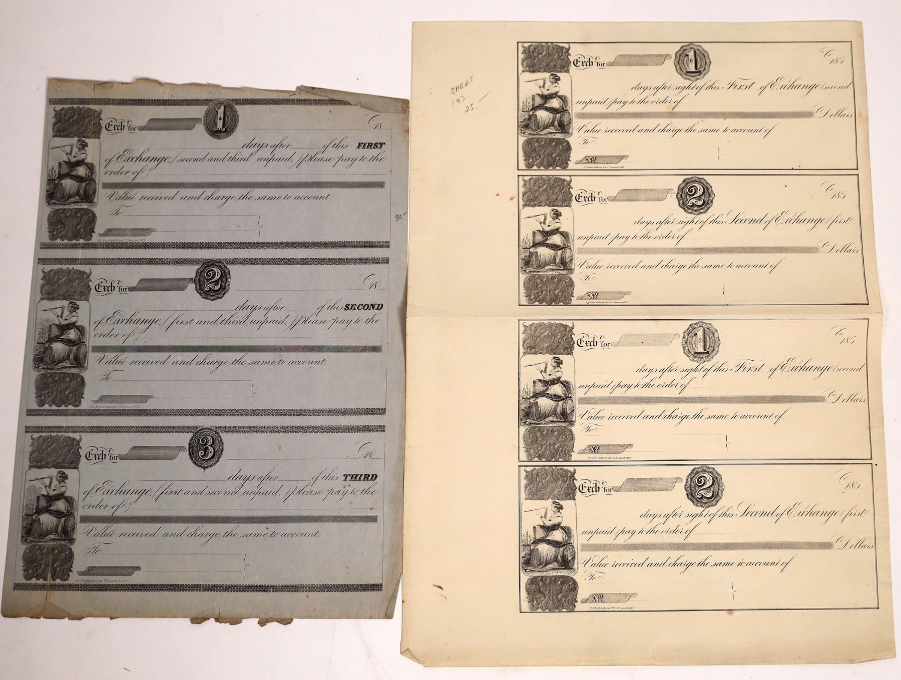 Two rare full pages of exchanges from an unidentified company. These are unused exchanges, probably from around 1845-1860. The company is not identified, but these exchanges were printed by R.C. Root, Anthony & Co. in New York. These exchanges also have a vignette of a woman sitting on a barrel looking through a telescope. There is also a ship in the background of the vignette. This vignette could suggest that these exchanges are from some kind of marine merchant company. Approx. 12 x 16.75, good condition, some tears around the edges. New York