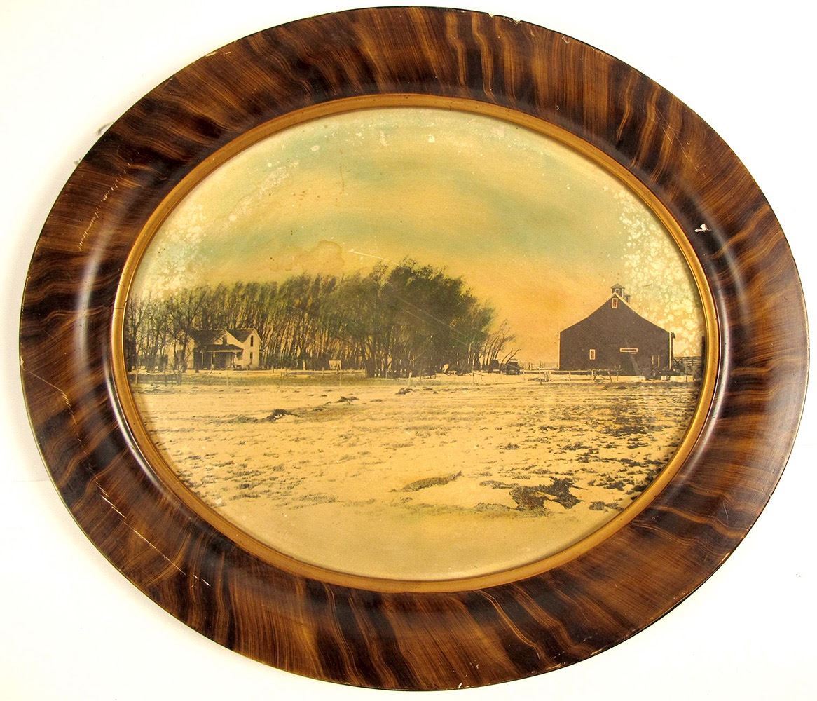 This is a vintage photograph in an old wood frame. It measures 22"x 19" and shows a farm house, complete with large barn. Piece has no glass, an easy fix, and appears to be hand colored. A great addition to the parlor. . Date: Location: HWAC# 56629