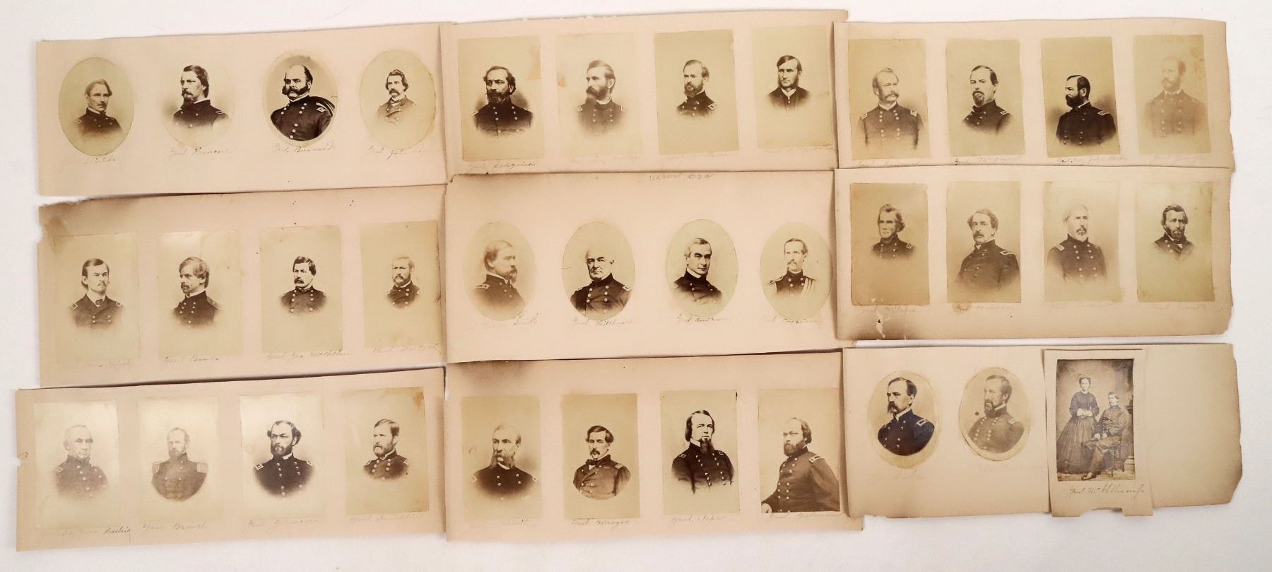 Thirty-one CDV-sized images of Union generals mounted to cardstock. Some of the images appear to be original photographs, while others are photographs of engravings. At least some of these engravings are by American engraver Alexander Hay Ritchie. Ten of the images are cut into ovals instead of the traditional rectangular CDV shape. Significant individuals pictured in this collection include Gen. Burnside, Gen. Hancock, Gen. Grant, and numerous others. The photos likely originate from New York, as the archive they belonged to focuses on New York politicians; they may be from New York photographer Mathew Brady, whose photos were used as references for some of the included engravings.