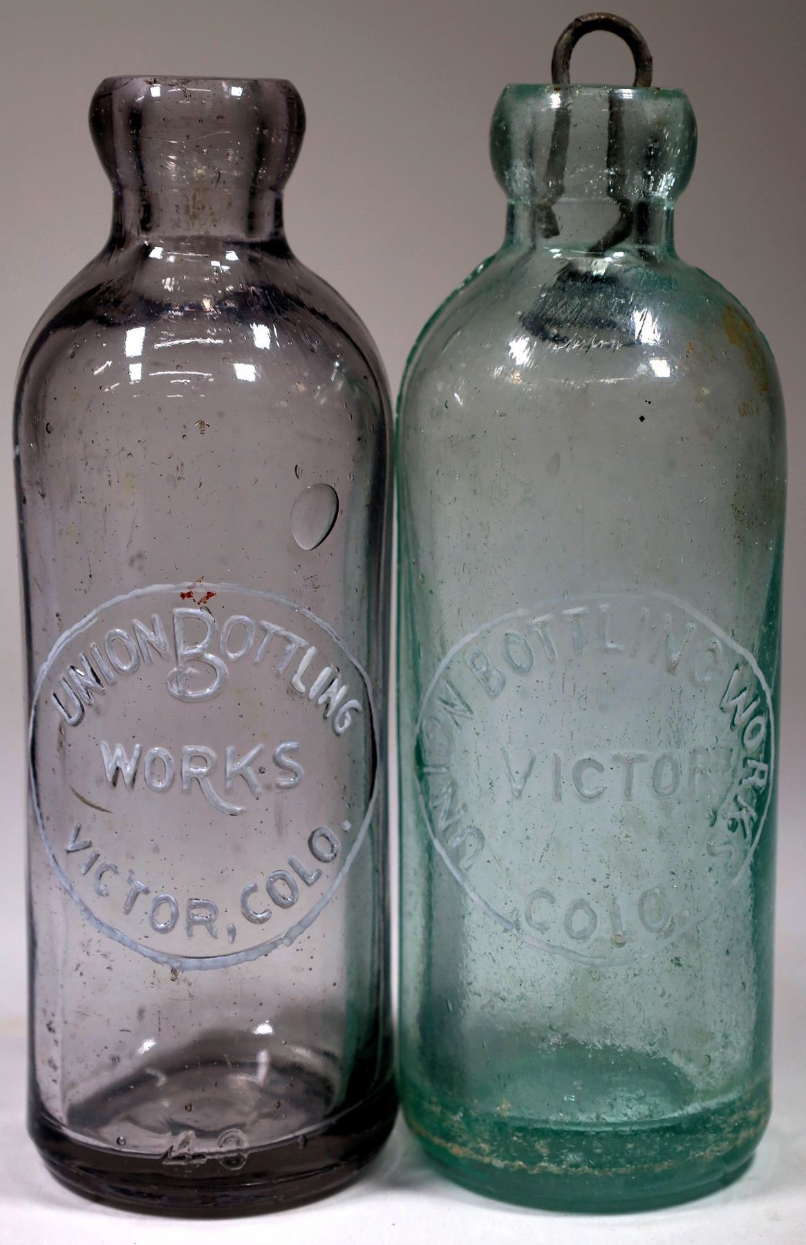 2 embossed. Smokey Union Bottling/Works/Victor, Colo.-a few base bruises. Aqua, Union Bottling Works/Victor/Colo. Some case wear. No apparent chips or cracks.