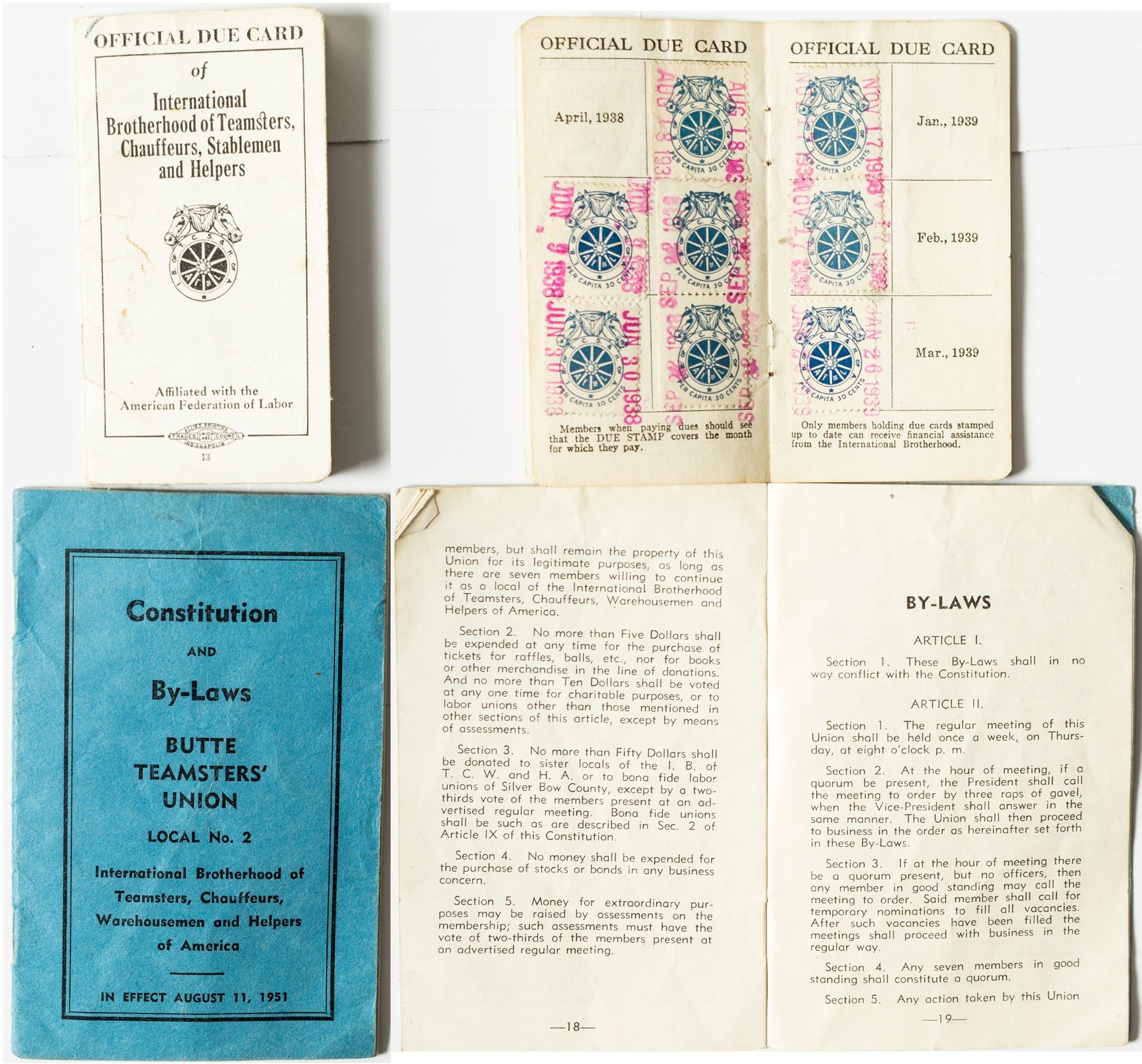 Official dues card, with dues paid stamps, for the International Brotherhood of Teamsters, Chauffeurs, Stablemen and Helpers. 1938-1939. Constitution and By-laws, Butte Teamsters Union, Local 2 dated 1951. Great pieces of labor history.