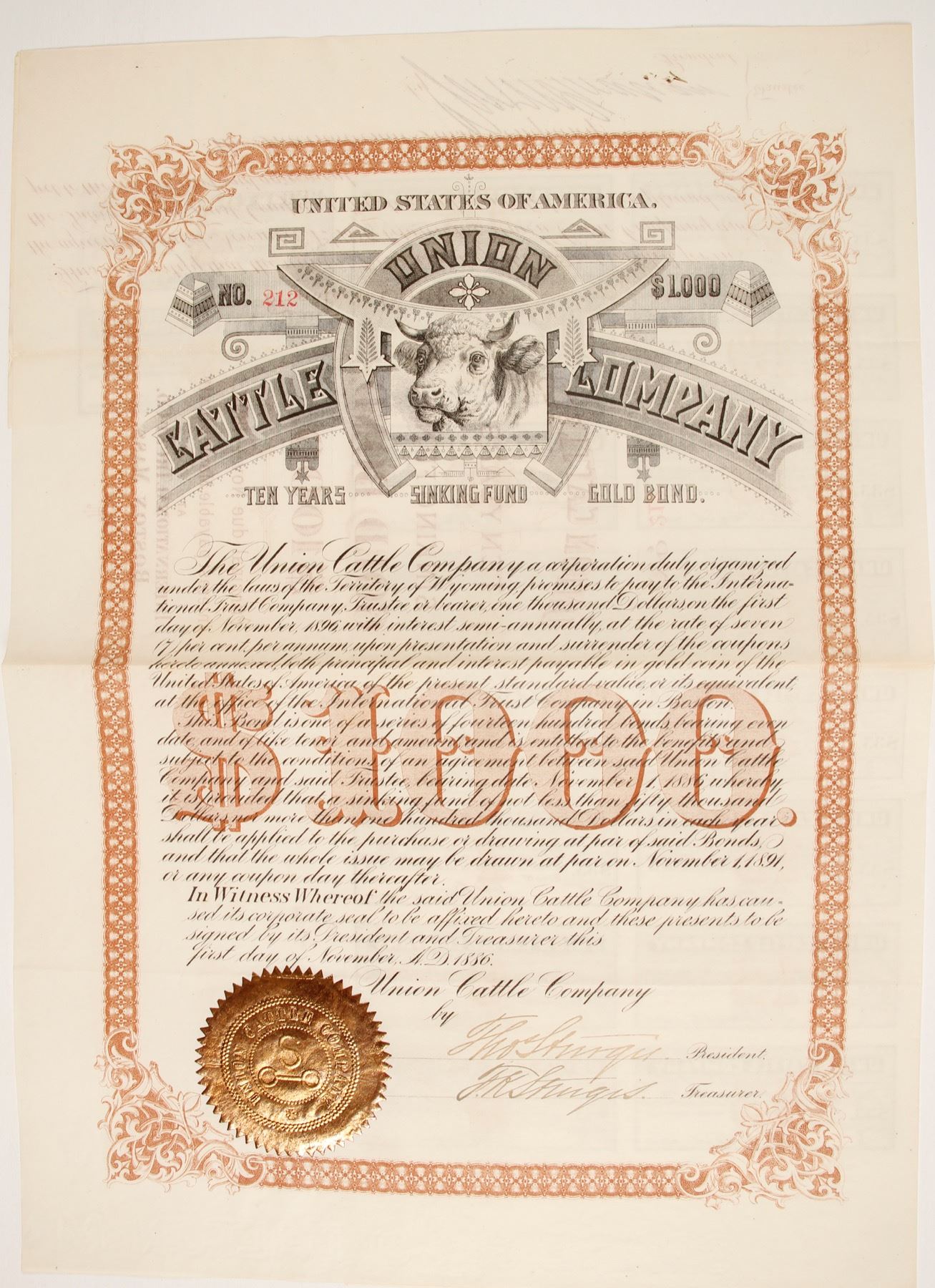 $1,000 bond dated 1886 from the Union Cattle Company incorporated in Wyoming Territory. Coupons 3-20 still attached. Vignette of a bull and nice bright gold seal. Signed by Thomas Sturgis president and FK Sturgis treasurer. Signed by famous Wyoming cattle entrepreneur Thomas Sturgis as president. He was secretary of the Laramie County Stock Association three years after it was organized and served for eleven years; he was one of the most influential men in this area's cattle business. In 1883 Sturgis submitted a proposal for the disposition of mavericks. He assumed that any man ran his own head of cattle, other than the big land owners, had no possibility of ownership and must be a cattle rustler. This train of thought lead directly to the Wyoming Range Wards. The Johnson County War, also known as the War on Powder River and the Wyoming Range War, was a range conflict that took place in Johnson County, Wyoming from 1889 to 1893. The conflict began when cattle companies started ruthlessly persecuting alleged rustlers in the area, many of whom were innocent settlers that competed with them for land, livestock and water rights. As tensions swelled between the large established ranchers and the smaller settlers in the state, violence finally culminated in Powder River Country, when the ranchers hired armed gunmen to invade the county. The gunmen's initial incursion in the territory aroused the small farmers and ranchers, as well as the state lawmen, and they formed a posse of 200 men that led to a grueling stand-off. The siege ended when the United States Cavalry on the orders of President Benjamin Harrison relieved the two forces, although further fighting persisted in the following months. Prag Collection State: Wyoming City: Wyoming Cattle: Cheyenne Date: 1886