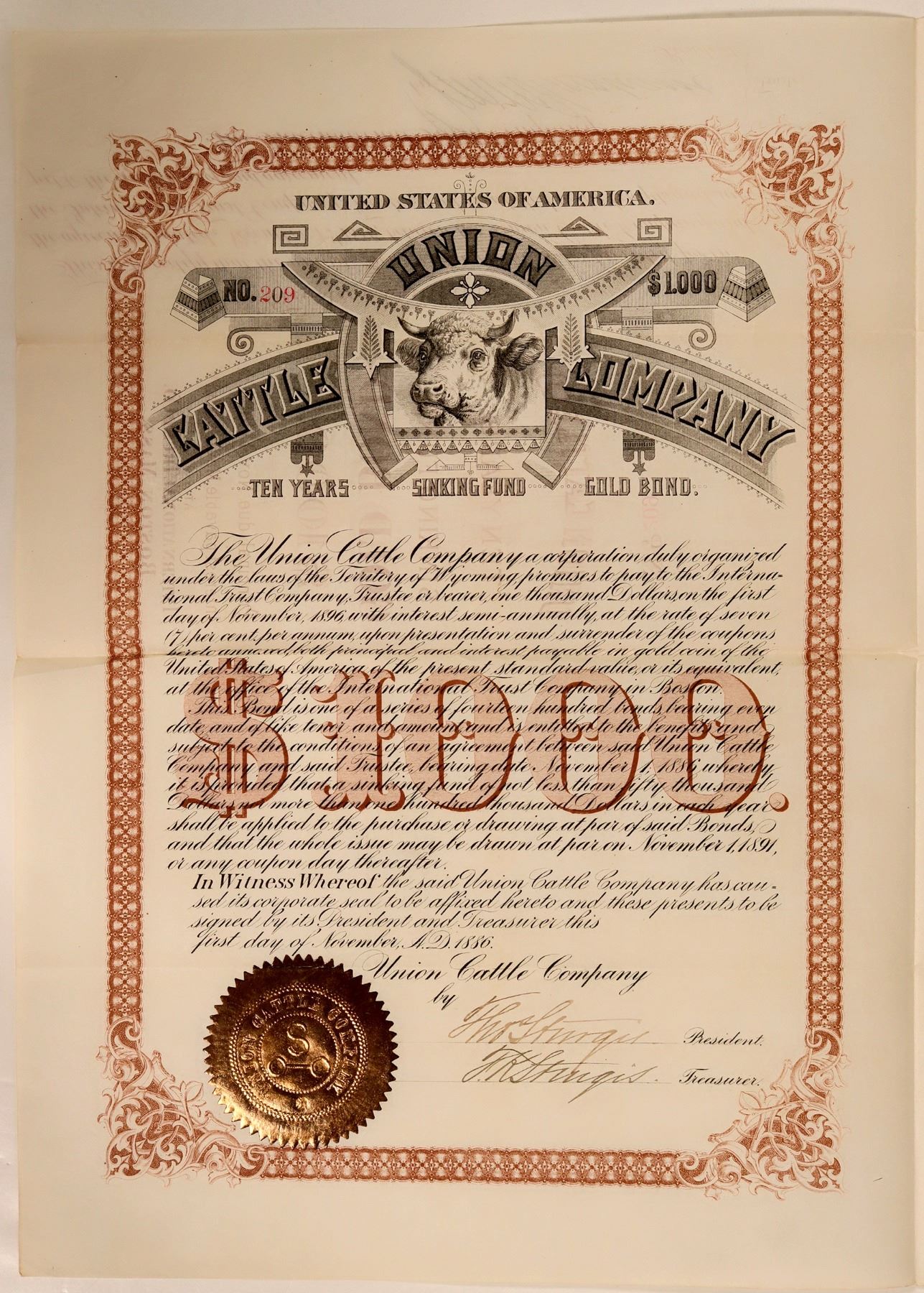 Number 209. 1886. Fabulous shiny gold seal with branding iron vignette in middle. Nice vignette of a steer at the top. Signed by Thos. Sturgis as president and FK Sturgis as treasurer. Eighteen coupons attached at the right. Condition is near mint (outside of folds). Signed by famous Wyoming cattle entrepreneur Thomas Sturgis as president. He was secretary of the Laramie County Stock Association three years after it was organized and served for eleven years; he was one of the most influential men in this area's cattle business. In 1883 Sturgis submitted a proposal for the disposition of mavericks. He assumed that any man ran his own head of cattle, other than the big land owners, had no possibility of ownership and must be a cattle rustler. This train of thought lead directly to the Wyoming Range Wars.