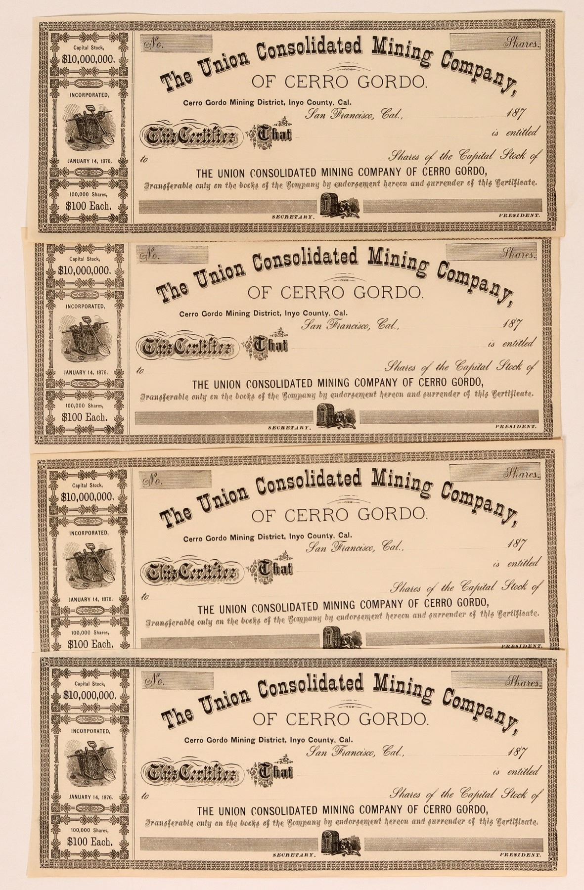 Lot of 4 unissued. Cerro Gordo Mining District, Inyo County, Cal. printed below title. Dateline San Francisco, 1870s. Inc. in 1876. Two vignettesL mining equipment (left) and dog next to safe (bottom center). Very good condition.
