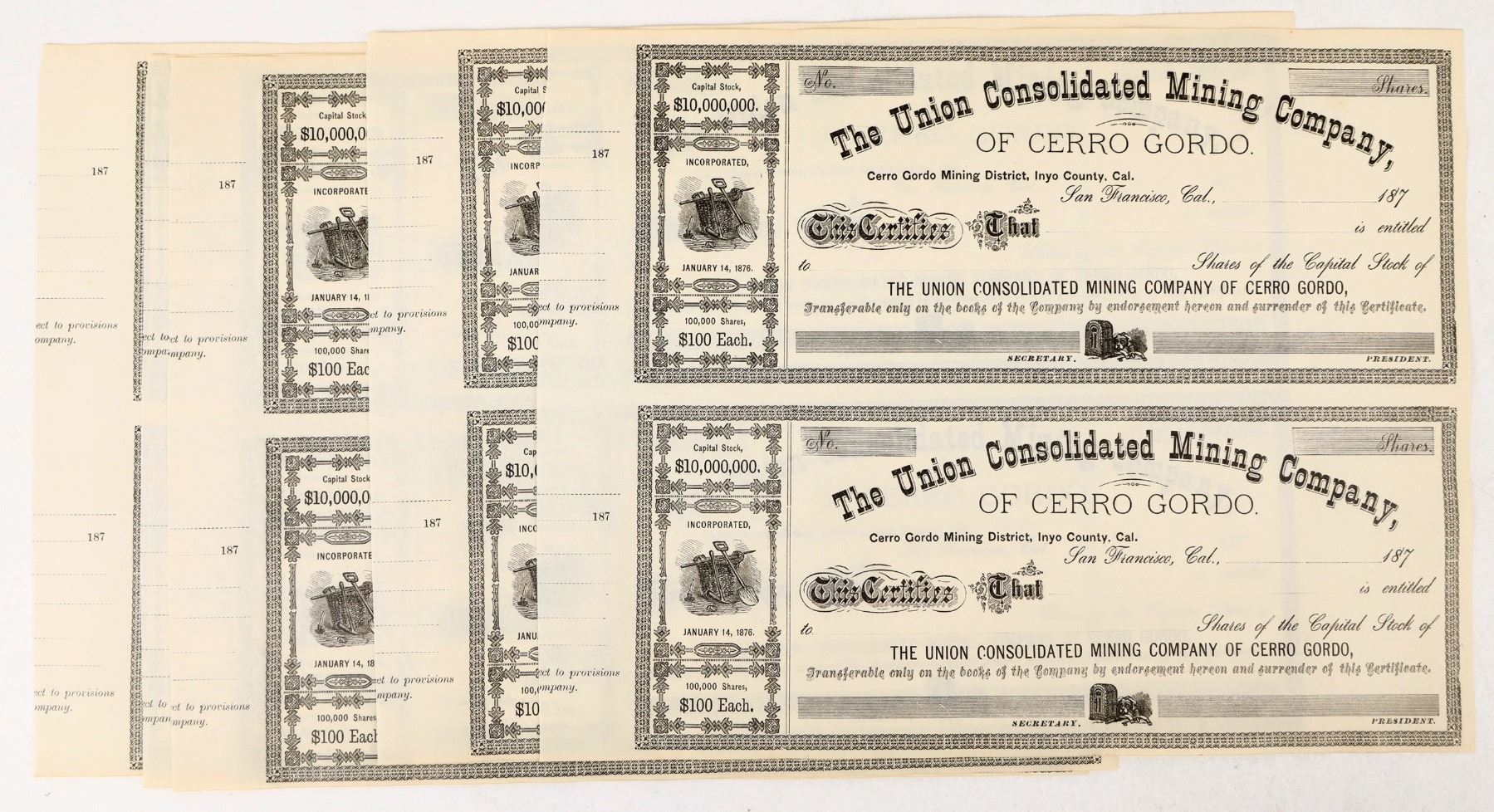 Group of 5 sheets of two unissued stocks each. c.1870s. Cerro Gordo Mining District, Inyo County, Cal. Very famous mine. We've never sold an issued example!