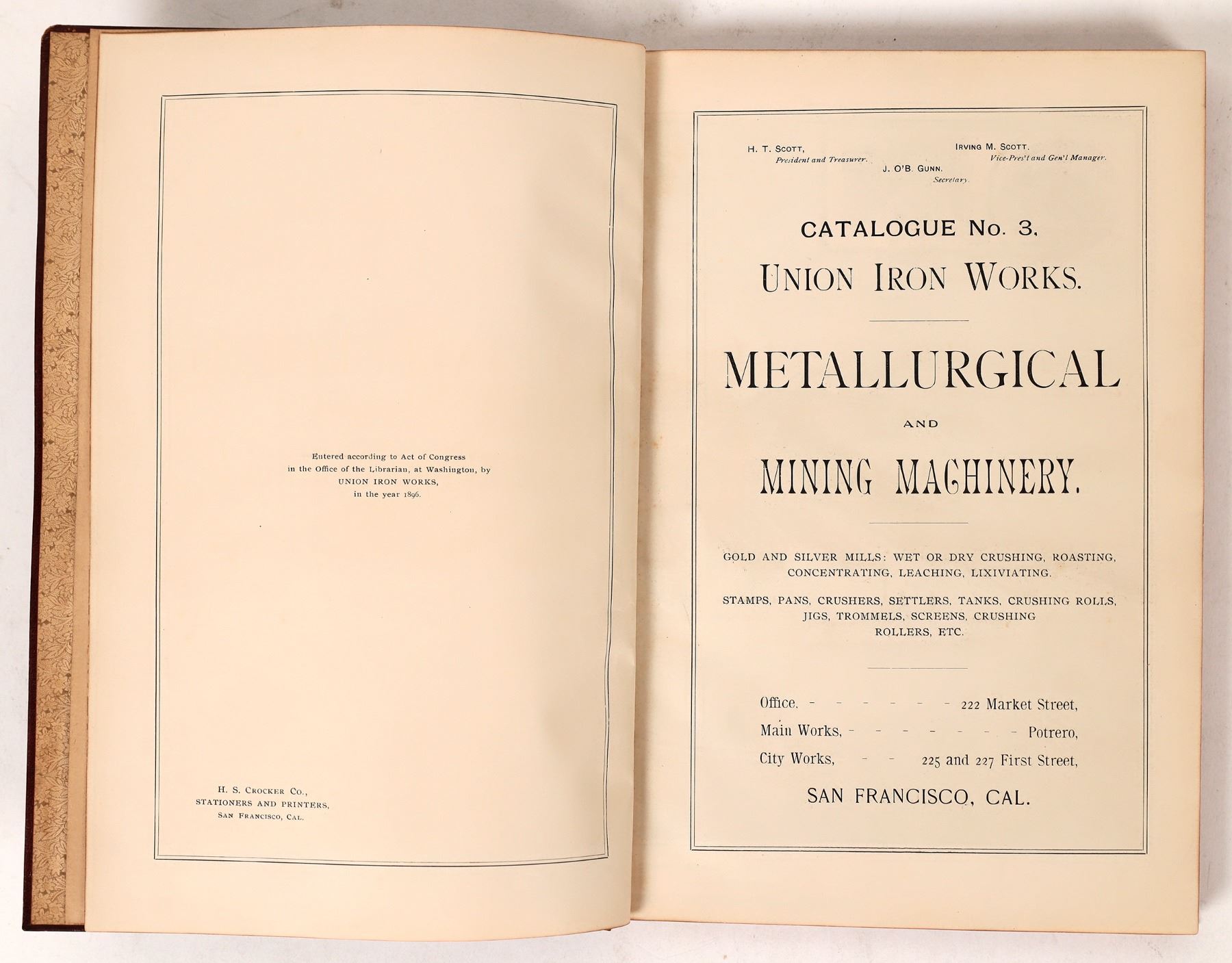 1896 Catalogue No. 3, Union Iron Works, Metallurgical and Mining Machinery by Jno. T Scott. Lots of illustrations of their iron and mining products with specifications. 203pp with index. California San Francisco 1896