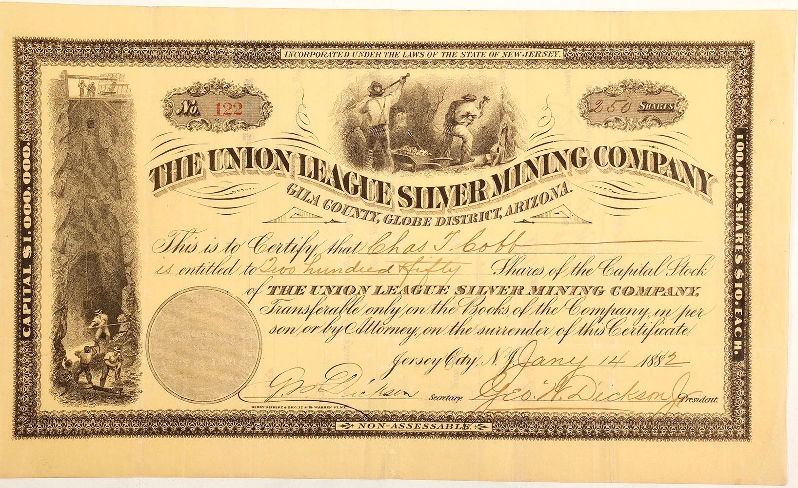 An early 1880's Arizona mining certificate. Number 122 for 250 shares to Charles Cobb. Signed by George Dickson and George W Dickson Jr. Underground mining vignette in top center and a bucket being hoisted down to the miners on the left. Several vertical folds and a couple of pinholes are all that mar this wonderful certificate. Balch (1882, p. 1178) reports the company’s property lies 800 feet northwest of Mack Morris mine, in the Richmond basin, Globe mining district. Ransome (1903, pgs. 114-117 and Barns, pgs. 103, 113) report that in 1876 Mack Morris was the locator of the first silver mine in Richmond Basin, where people could actually pick up silver nuggets. Morris’ mine was incorporated in 1881 and became the Union League Silver MC. The Union League name is derived from the Union League, a fraternal organization in support of the Union during and after the Civil War, still in existence today. The main office is in Philadelphia, which today houses the Union League collection. The building and contents are a marvelous complement to the Union theme, and to American history. Extra Rare. (Laguna Collection) HWAC# 59689 Date: 1882 Location: Union District, Globe, Gila County, Arizona