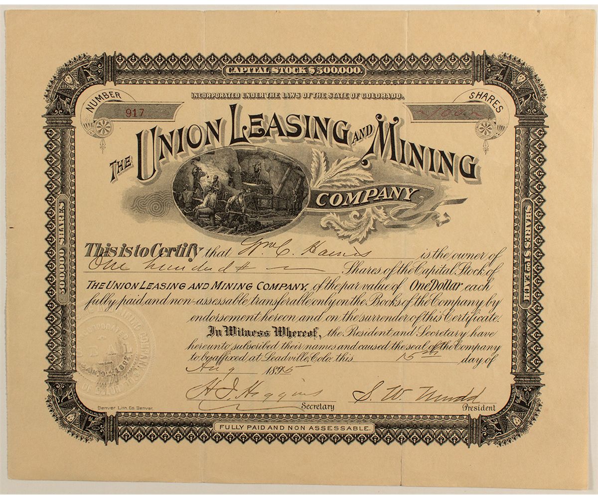 #912 for 100 shares to William Hainis(?). Signed by President SW Mudd(?) and secretary HJ Higgins.City: LeadvilleCounty: LakeState: CODate: