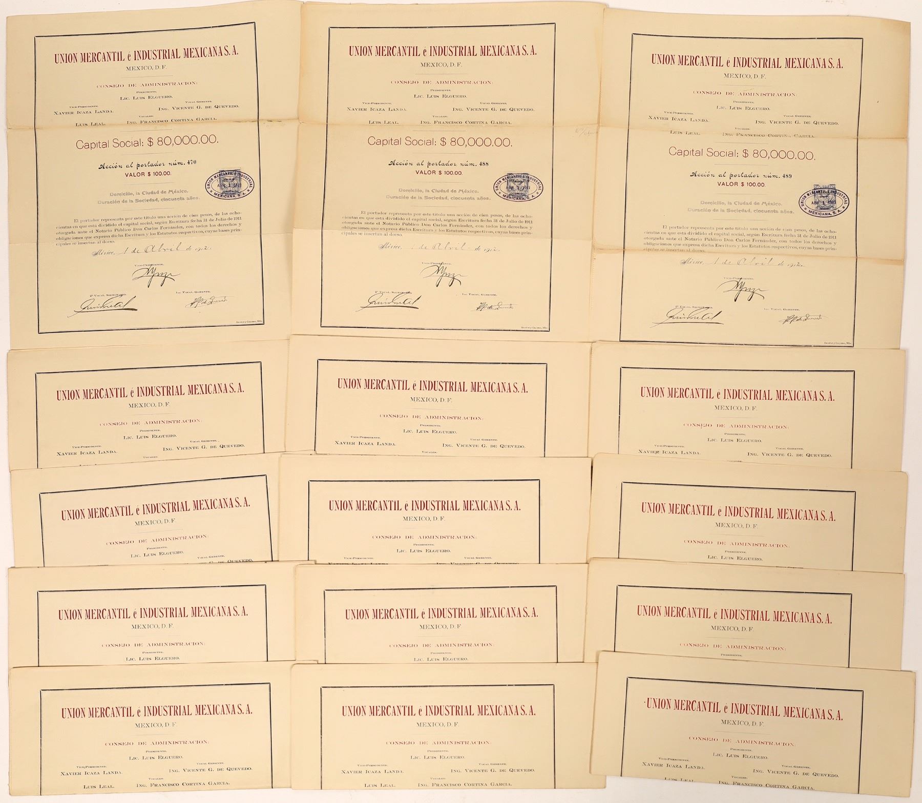 Lot of 15: Union Mercantile e Industrial Mexicana S.A. bonds issued 1912, include coupons.
