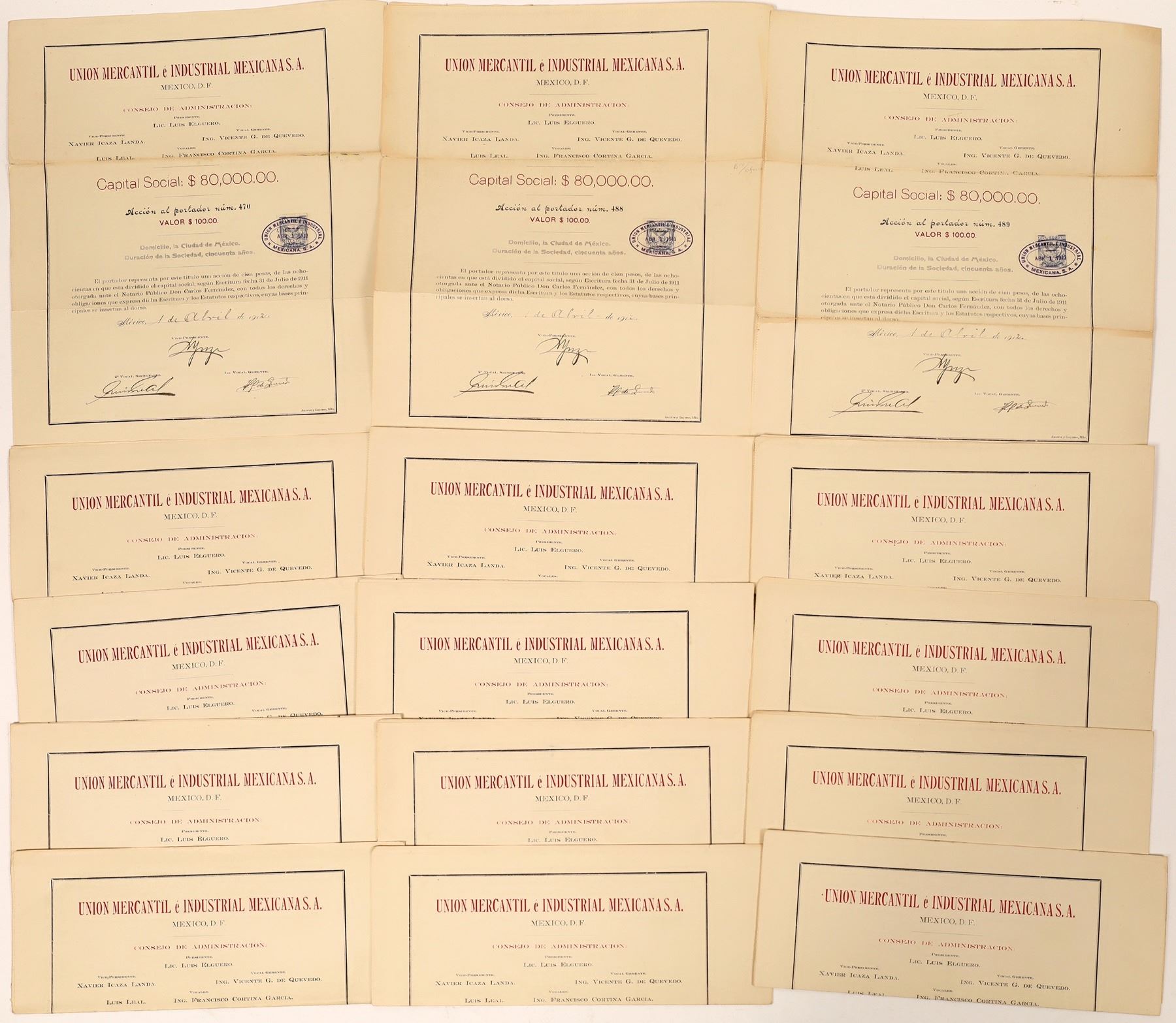 Lot of 15: Union Mercantile e Industrial Mexicana S.A. bonds issued 1912, include coupons.