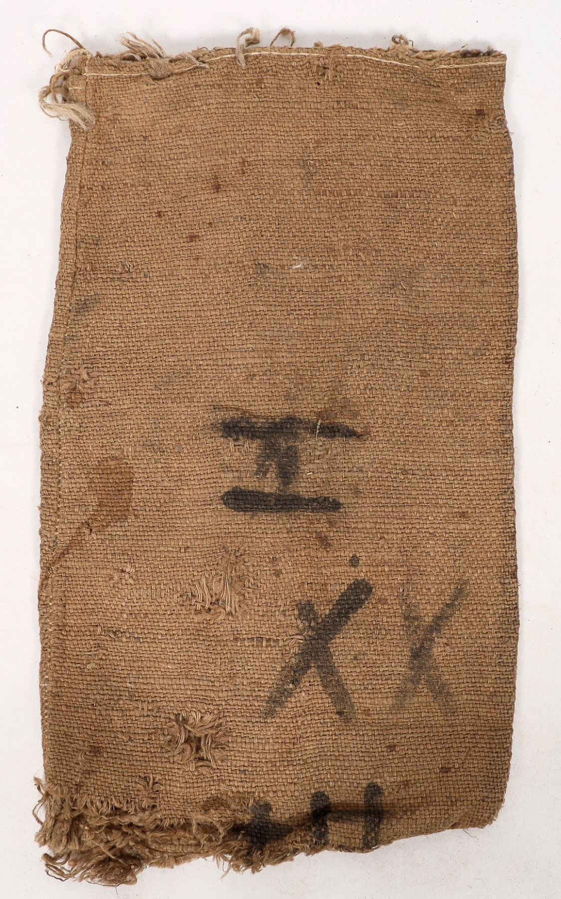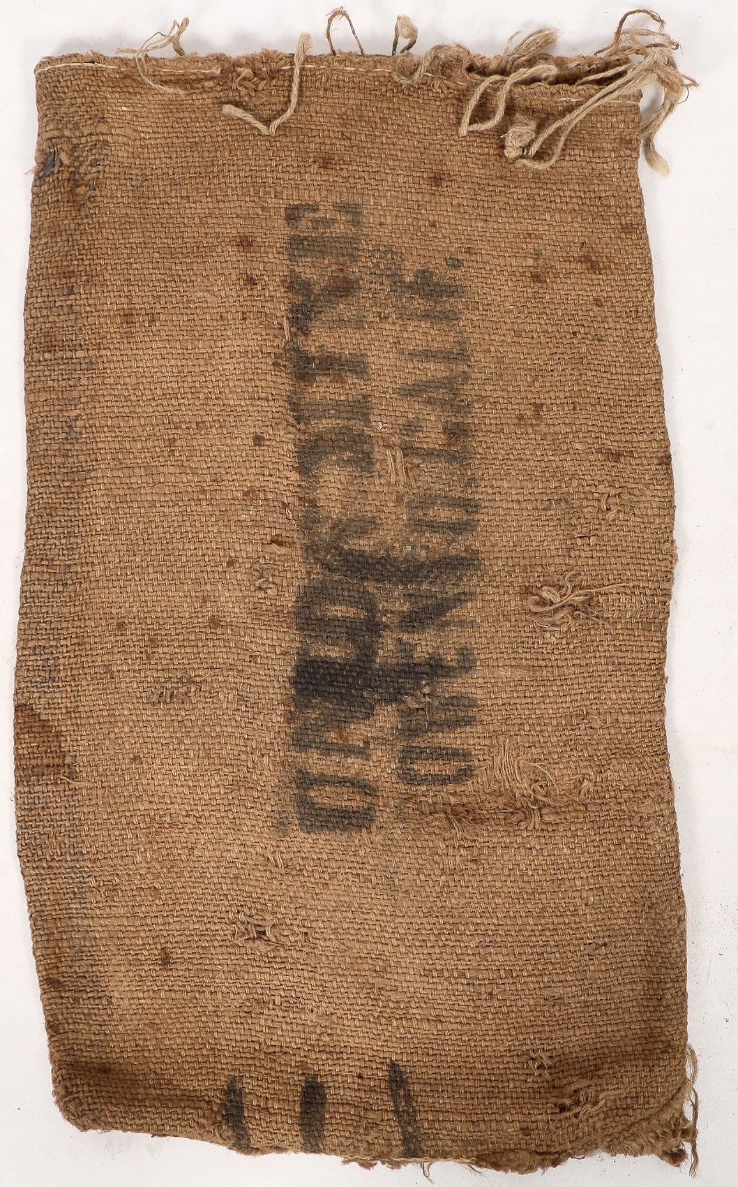 An antique ore bag from the Union Mine of Atolia, California, dating from c.1870s. The bag has a coarse weave with some wear and fraying at the mouth. It has the text 'UNION MINE / OWENYO CALIF.' printed in black ink (heavily faded, but still legible). A smear of black ink also obscures some text. The reverse side of the bag has the letters 'H' and 'XX' handwritten in black, perhaps indicating the origin of the bag's contents.