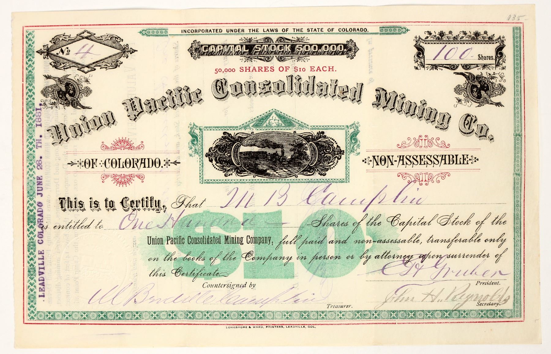 Inc. in Colorado. Low number 4, issued to treasurer MB Camplin in 1881 in Leadville. Signed by president Gruber, secretary Reynolds, and Camplin. Not cancelled. Green and red borders, green underprint, and locomotive vignette. Folds, clean. This company operated the Davenport and Camp Point claims on Long & Derry Hill at Leadville (Rocky Mountain News, June 8, 1881).