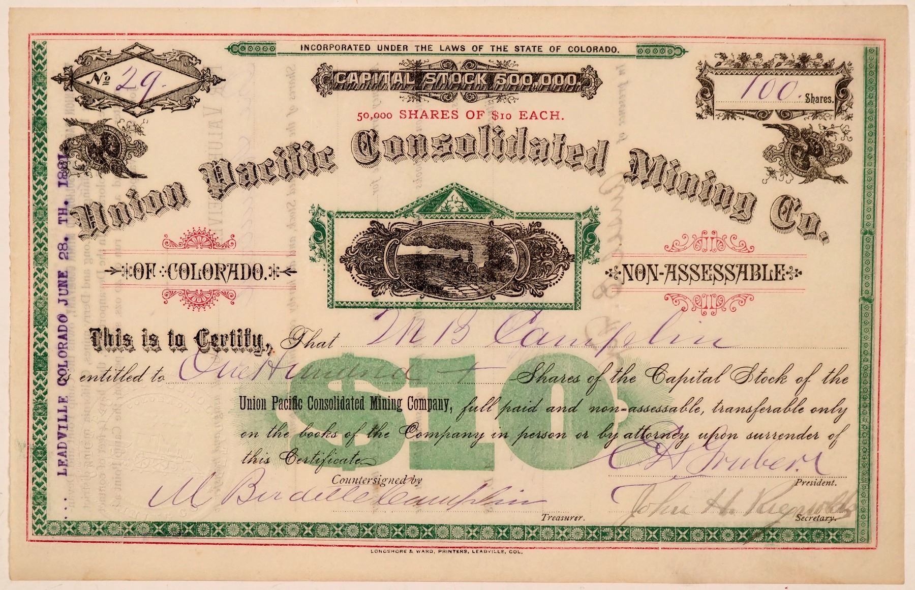 We could not find any info on this company in our library. 100 shares, issued 1881 to B. Camplin #29. Signed by president Gruber, treasurer Champlain and secretary. Stamped "Leadville, Colorado, June 28th, 1881"Black, red and green on white. Green underprint "$10." Small vignette of steam locomotive coming round the bend. No edge, corner, discoloration or