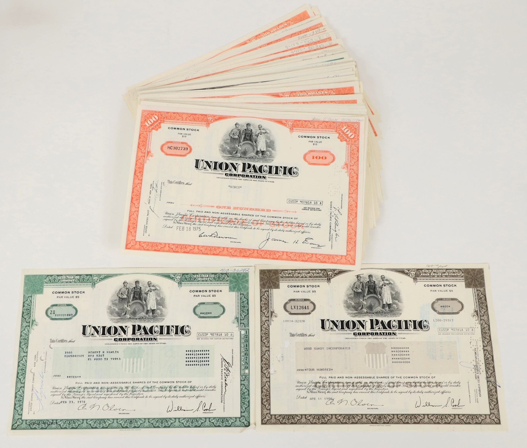 170 Union Pacific Corporation common stock certificates, all cancelled, three colors: orange, dark green, dark brown, ~170 pcs., 12 x 8 in. President, James Evans; Secretary C.N. Olsen; President, William S. Cool.
