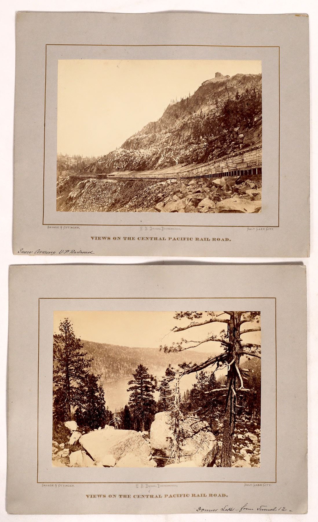 Two 9"x 11" photos taken by Charles Savage of Savage & Ottinger of Salt Lake City, the same photographer who captured the image of the driving of the golden spike at Promontory Point, Utah. One photo is labeled "Donner Lake From Tunnel 12," the other, "Snow Covering UP Railroad." That one shows the snow sheds along the line. Historic and beautiful. Please see photos for more details. Donner Lake California. DON'T FORGET TO CHECK OUT OUR RAILROAD SECTION!