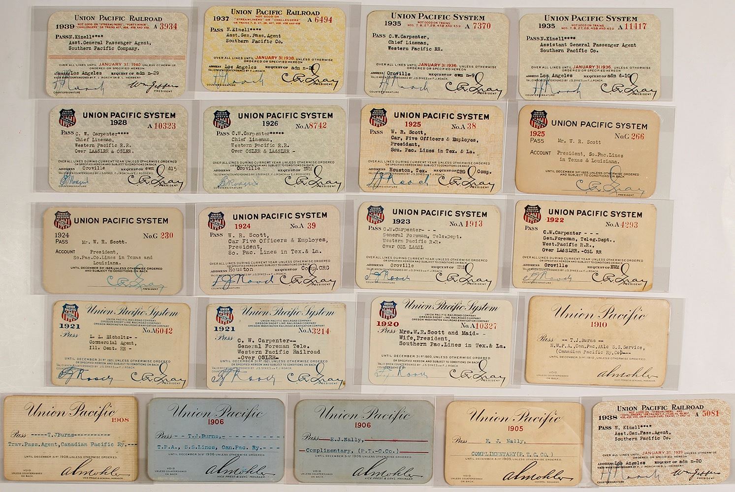 Lot of 21 passes, issued 1905-1939. Included: 1905, two for 1906, 1908, 1910, 1920, two for 1921, 1922, 1923, two 1924, two for 1925, 1926, 1928, two for 1935, 1937, 1938, and 1939. (Potter Collection) HWAC# 59915 Date: 1905-1939 Location:
