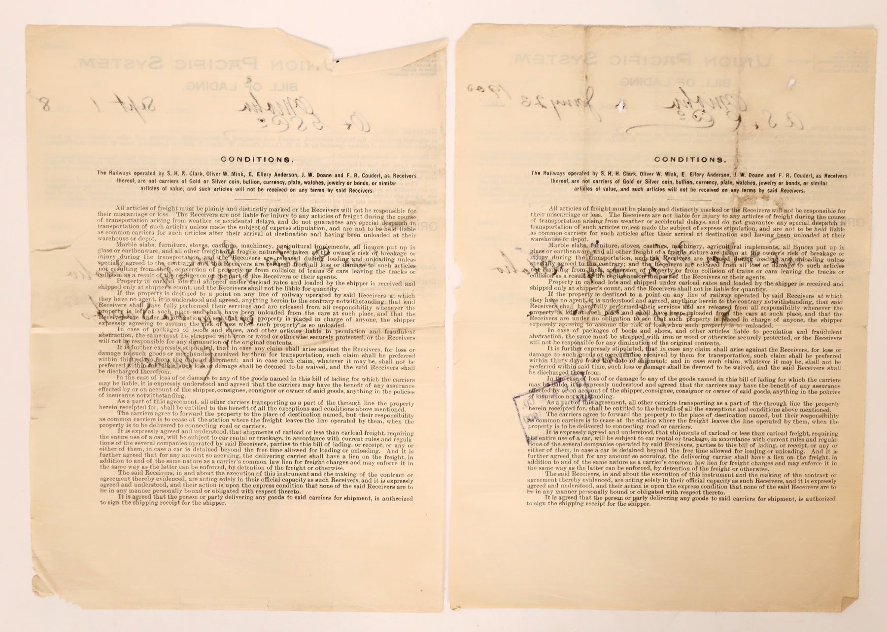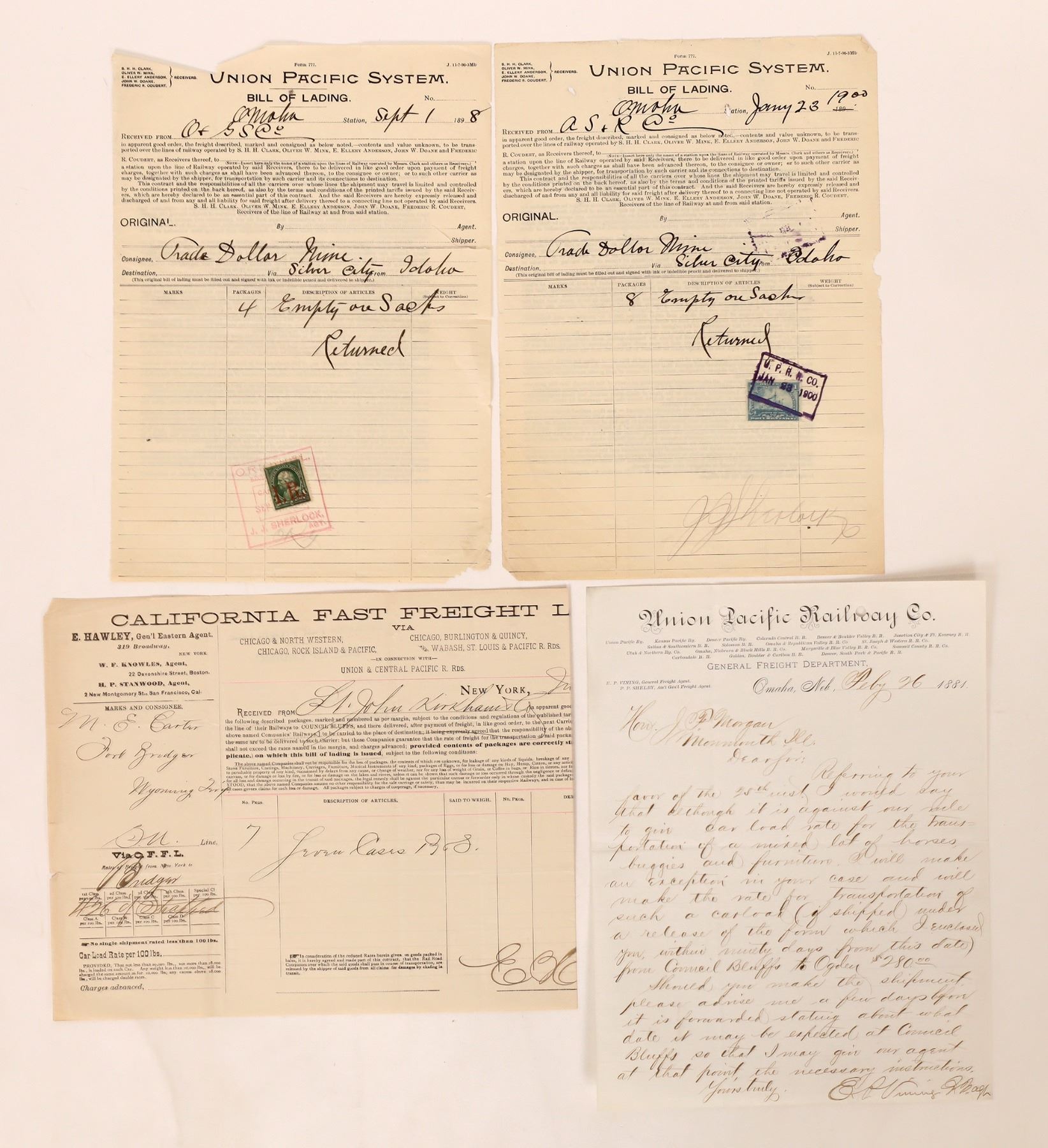 1882 California Fast Freight waybill, 1881 Union Pacific RW letterhead, 1898 and 1900 Union Pacific System bill of lading related to Trade Dollar Mine in Silver City, ID.
