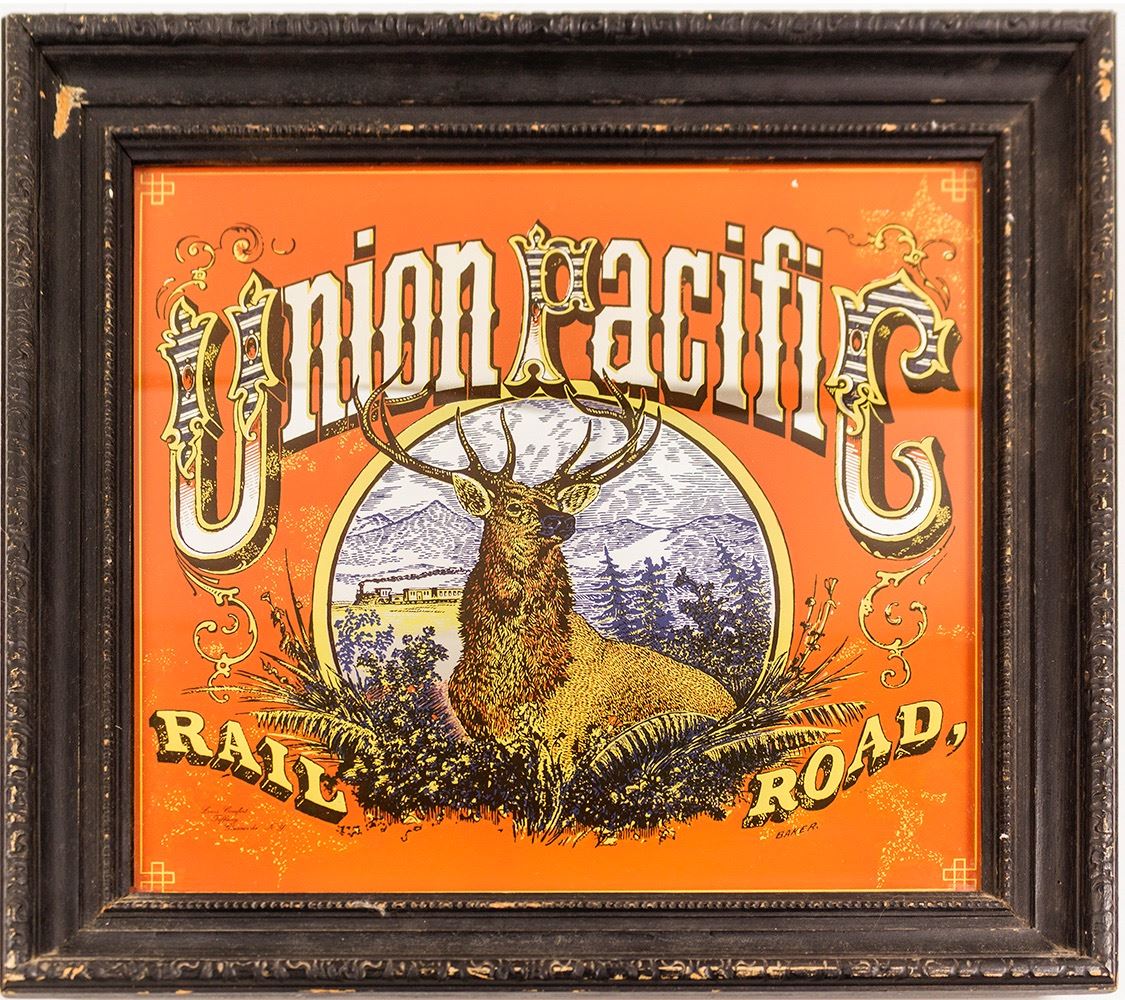 This is a one of two hundred produced Union Pacific Railroad reverse painting mirror. Excellent and tastefully painted mirror by artist "Baker" and is so-marked. There were two hundred of these sold in 1902 for the Union Pacific executives and vendors. They were produced by "Louis Comfort Tiffany Glass-Works New York" and so marked. A rare piece of railroad memorabilia in limited edition of the reverse glass procedures. It is a mirror measuring 13 in. X 14 in. and is 16 IN. x 17 IN. outside the frame. The artist has signed it in the lower right and corner and in the left hand corner it is marked "Louis Comfort glass-works New York". A rare piece of American railroad history. HWAC# 55331