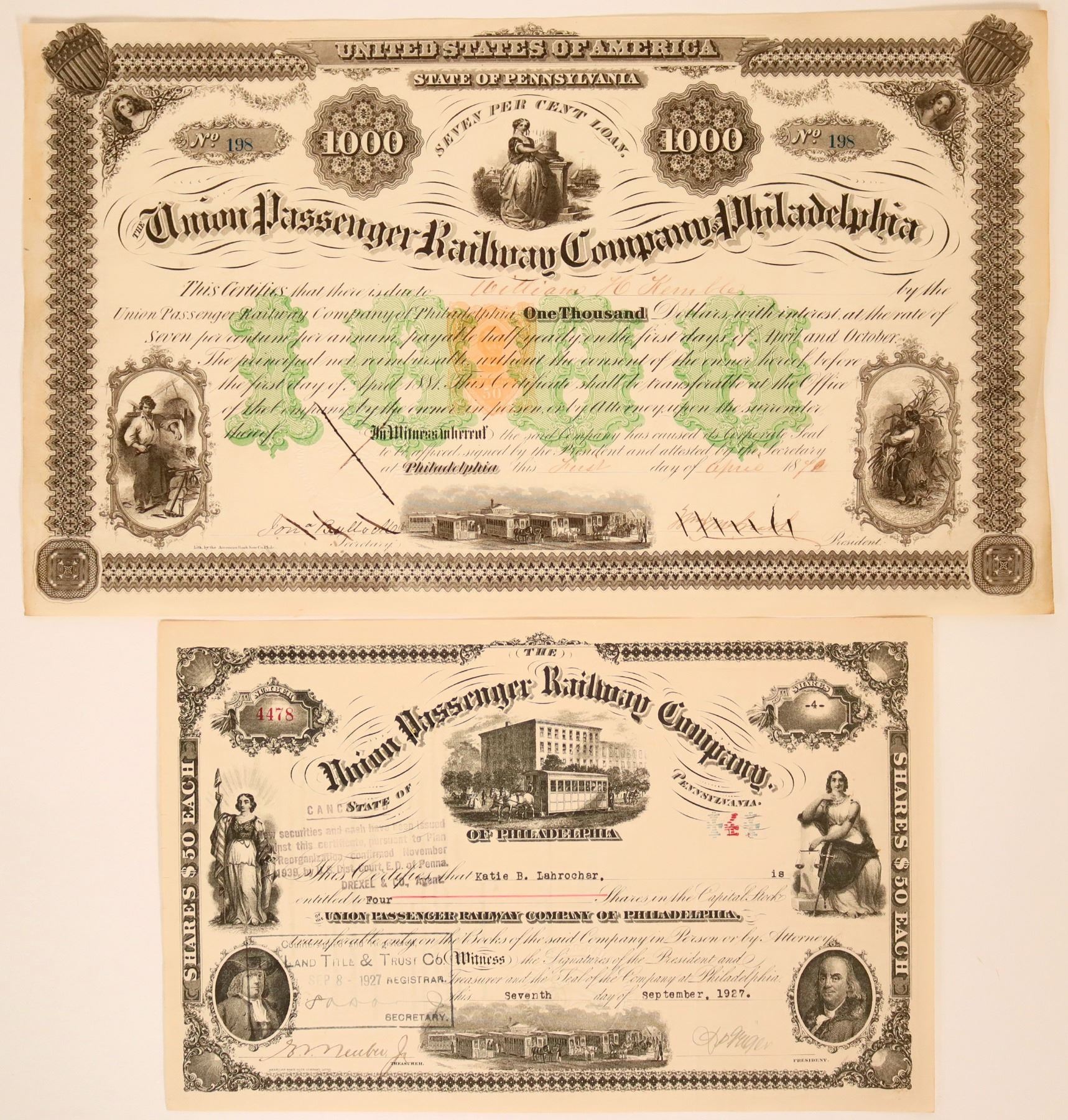 2 certificates. Incorporated on November 22, 1873. 1. #198. I/C, $1000 7% 10 yr. Loan issued April 1, 1871. Black, embossed seal, vignettes: top woman a/ships background, bottom right farmer, bottom left blacksmith, bottom trolly rail yard. 1000 green underprint. orange underprint 50c revenue print. American Bank Note Co. Large horizontal format. VF 2. #4478, I/C, 4 shares @ $50 ea. issued Sept 7, 1927. signed president and secretary. Black, embossed seal, vignettes: top horse drawn trolly r-l, right justice seated, left Lady Liberty, bottom left William Penn, right Ben Franklin. bottom center trolly rail yard. American bank Note Co. EF