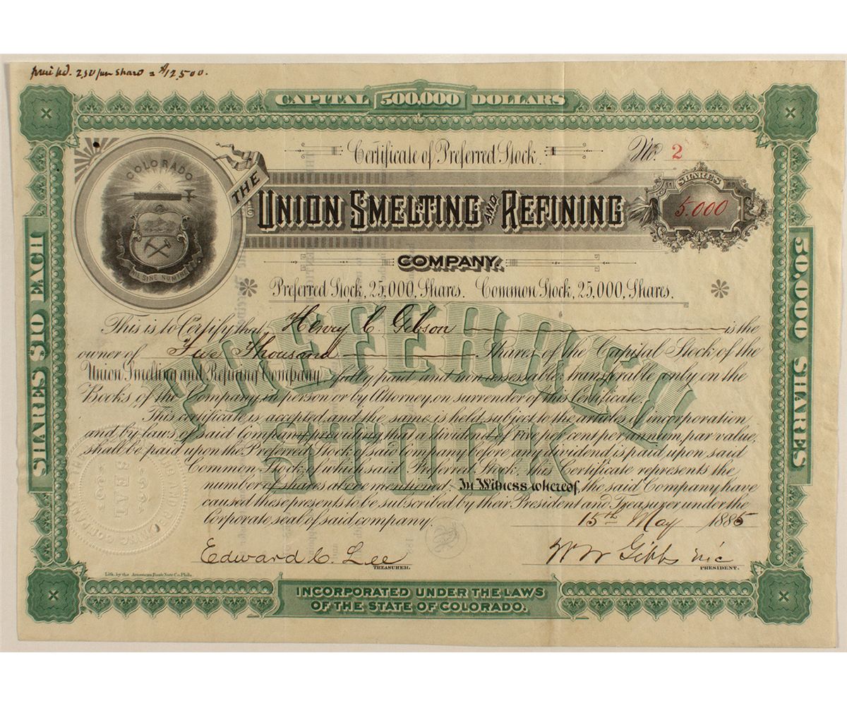 Incorporated in Colorado. No. 2. Uncancelled. Issued for 5,000 to Harvey C. Gibson on May 15th, 1885. Signed by W.W. Gibbs (vice president) and Edward C. Lee (treasurer). Green and black lettering. Vignette of Colorado seal. Reverse is not endorsed. Measures approx. 10 3/4" x 7 3/4". Some writing, wrinkling and toning.City: County: State: CODate: