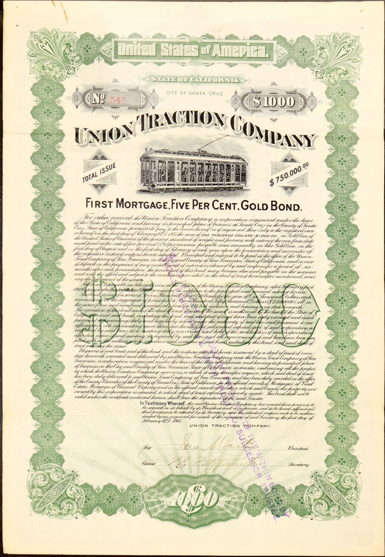 #545 of 750, I/C, $1000 5% 30 year First Mortgage gold bearer bond due 1935. Issued Feb 1, 1905 signed Jus. Martin Printer, GREEN, embossed seal, vignette of electric street car w/passengers under wavy title, "$1000" green underprint, "$1000" white overprint bottom w/ green underprint sunburst, The Union Litho Co. printer. Coupons attached missing 1-24. EF-AU condition. Ken Prag Collection