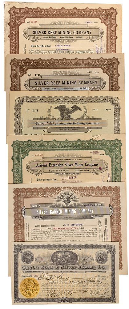 Unionville Stock Certificates (6)-SILVER REEF MINING CO./200 shares/1921 (2). #2) CONSOLIDATED MINING & REFINING CO./1500 shares/1922. #3) SHEBA GOLD & SILVER MINING CO./100 shares/No.239/1902. #4) SILVER BANNER MINING CO./1250 shares/No.16/1920/excellent condition/company name text printed in silver/vignette of torch and flame. #5) ARIZONA EXTENSION SILVER MINES CO./100 shares/1920