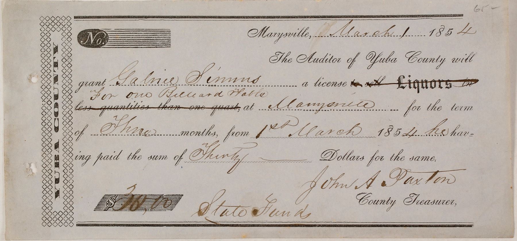 This 1854 liquor license is for Galnie (Gabriel) Simms. He opened the Franklin House on First Street near a cluster of other black owned businesses. This was the only known African American hotel in the region in the 1850's. He got his money as one of the owners of the Sweet Vengeance Mine and as trustee of the Rare, Ripe Gold and Silver Mining Company. Signed by treasurer John A Paxton who would become an important early Nevada banker (Virginia City, Austin, Eureka). Date: 1854 Location: Marysville, California HWAC# 57375