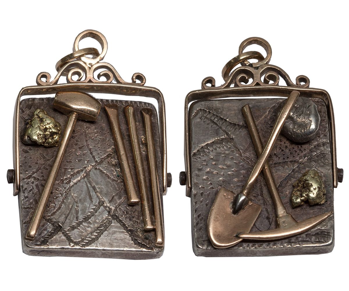This small silver ingot, dressed with gold and silver nuggets and 14kt gold mining tools is a classic American Victorian watch chain ingot. The ingot measures about 1" x 7/8" x 1/8" thick, and weighs 0.79 troy ounces. The silver ingot itself has ornate hand engraved mountain scenes on both sides. The nature of the mountains, accompanied on the ingot by gold nuggets (one on each side) and a silver nugget indicate that the ingot may be from one of the Colorado mining families. The piece is set into a 14kt side mounted swivel, such that the ingot can rotate and both sides can be seen. While this was a very expensive custom piece for a mining man, unfortunately his name is not recorded on the face or edges of the ingot. The construction and appearance appear consistent with the late 1860's to circa 1880 period. The only information known to us is that it came from a collection in Denver, but the historic origin is unknown.City: County: State: CODate: