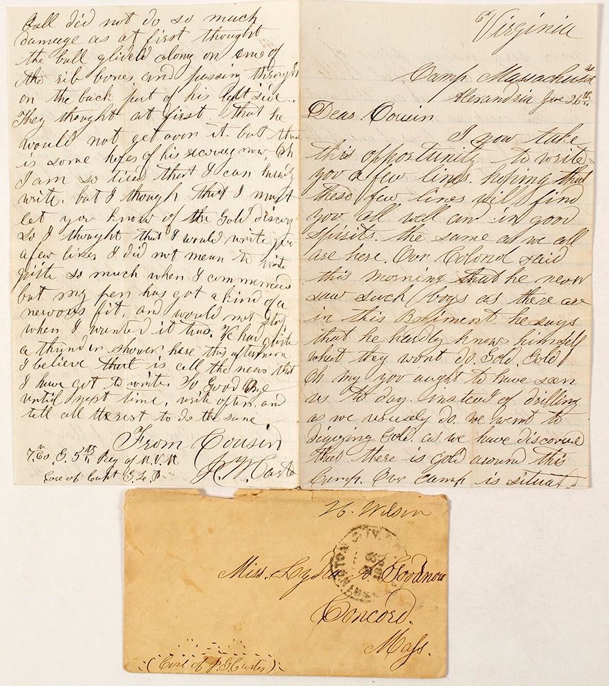 June 28, 1861 postmark from Washington City. Good to Fair. Letter is 8 x 5" and four pages. The soldier writing RM Casto(?) is stationed with Company G of the 5th Regiment of Massachusetts volunteers. One page is about digging for gold near where he is stationed at Camp Massachusetts. "Instead of drilling as we usually do, we went to digging gold." A beautiful little creek runs below the camp and the 'boys' can be found there as gold has been found. "One of the boys washed out about $2.00 worth this forenoon." Also news of an officer receiving a promotion to the regular army and a soldier who shot himself. Camp Massachusetts was at Shuter's Hill, near Alexandria, Virginia. They arrived there on June 2, 1861. (Al Adams Gold Rush Memorabilia Collection) Date: 1861 Location: Washington City, District of Columbia HWAC# 57091