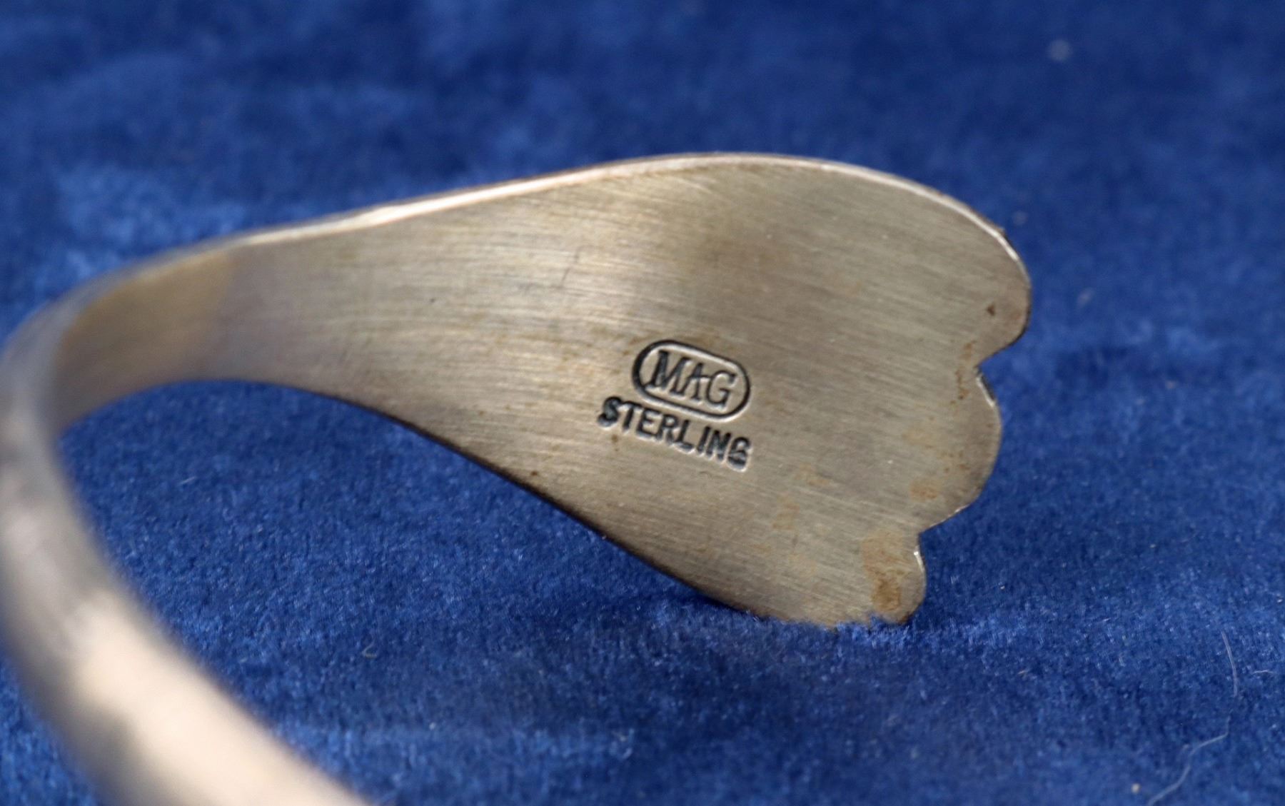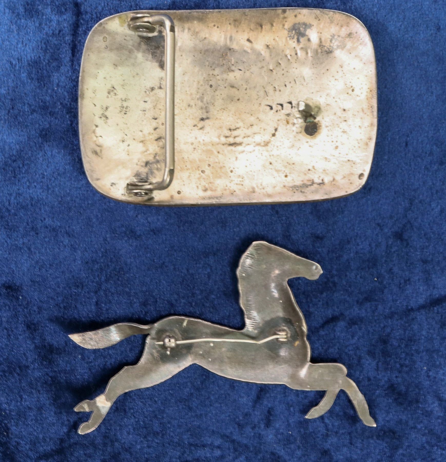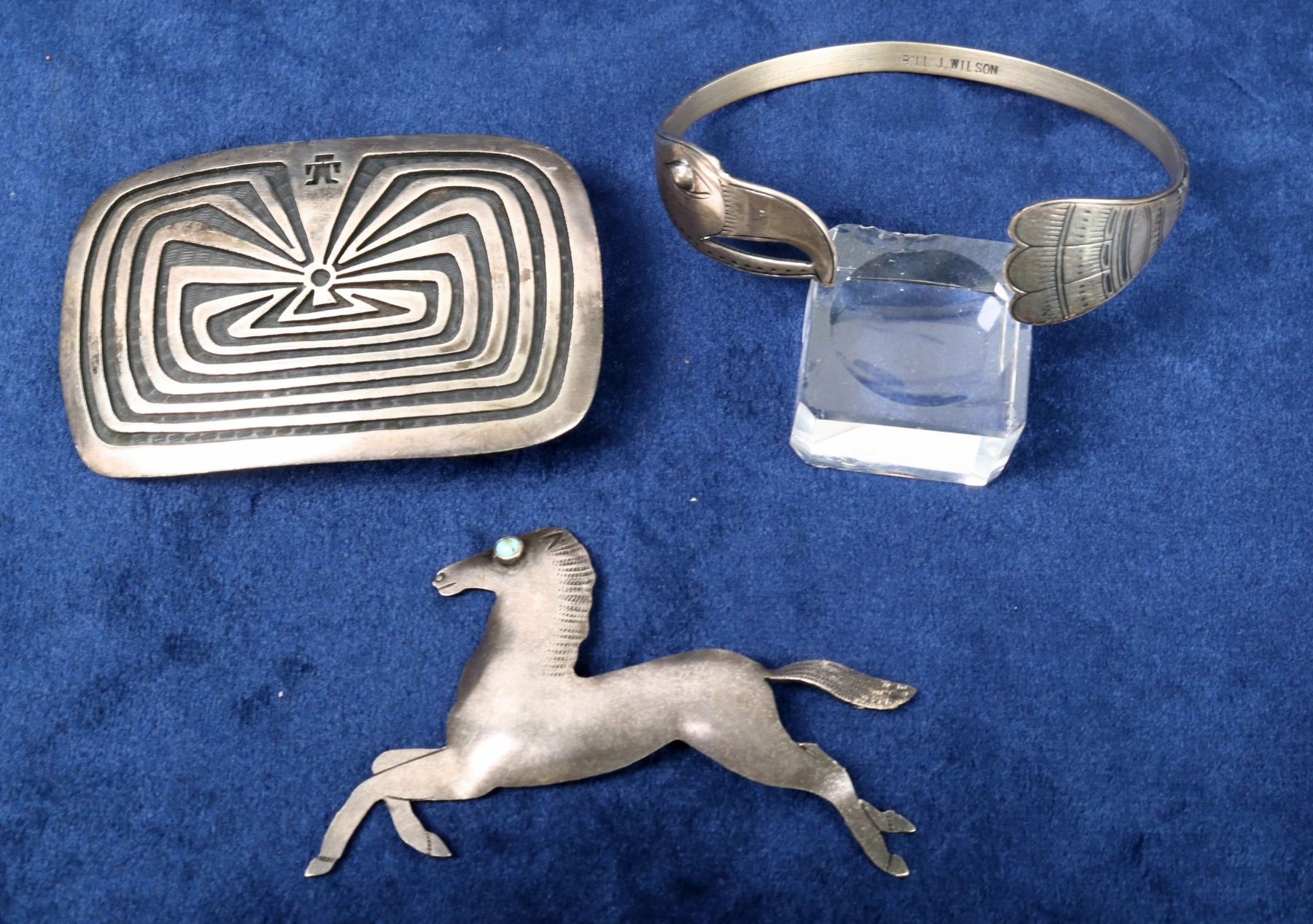 Vintage Northwest Billy J. Wilson eagle sterling silver adjustable bracelet/cuff--Eagle head and tail, form opening of cuff, etched sterling. Amazing design! Alvin Sosolda vintage Hopi belt buckle--Man in a Maze. 3" x 2". Silver galloping horse pin with turquoise eye--3" x 2". This lot is a treasure!