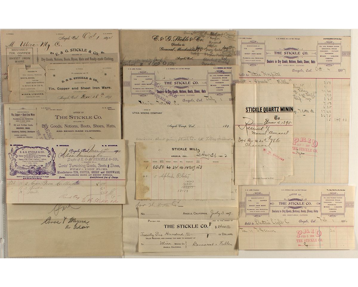 12 pieces. Unique Stickle billheads, letterheads, assay reports, etc.City: Angels CampCounty: CalaverasState: CADate: