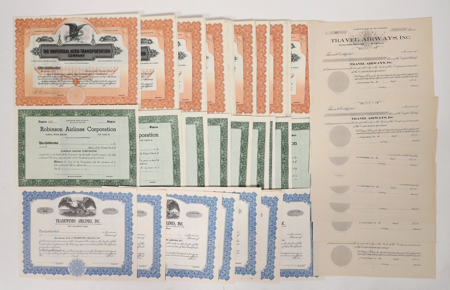 A group of approximately 90 unissued and uncancelled stock certificates from four airlines: Universal Aero-Transportation Co. (approx. 50), Travel Airways Inc. (11), Tradewinds Airlines Inc. (9). and Robinson Airlines Corporation (approx. 20). All in excellent condition.