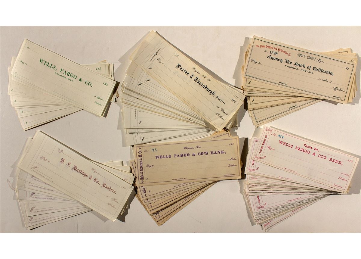 Lot of 243! Includes: 12 Wells, Fargo & Co. c.1860s (territorial); 30 Hale & Norcross S.M. Co., c.1880s; 100 Savage Mining Co. (Wells Fargo), c. 1880s; 36 Pless Dredging and Reclamation Co. and Justice Silver Mining Co., c.1890s; 20 B.F. Hastings & Co. Bankers, c.1860s; and 45 Paxton &Thornburgh (N.T. dateline). (Prag Collection)