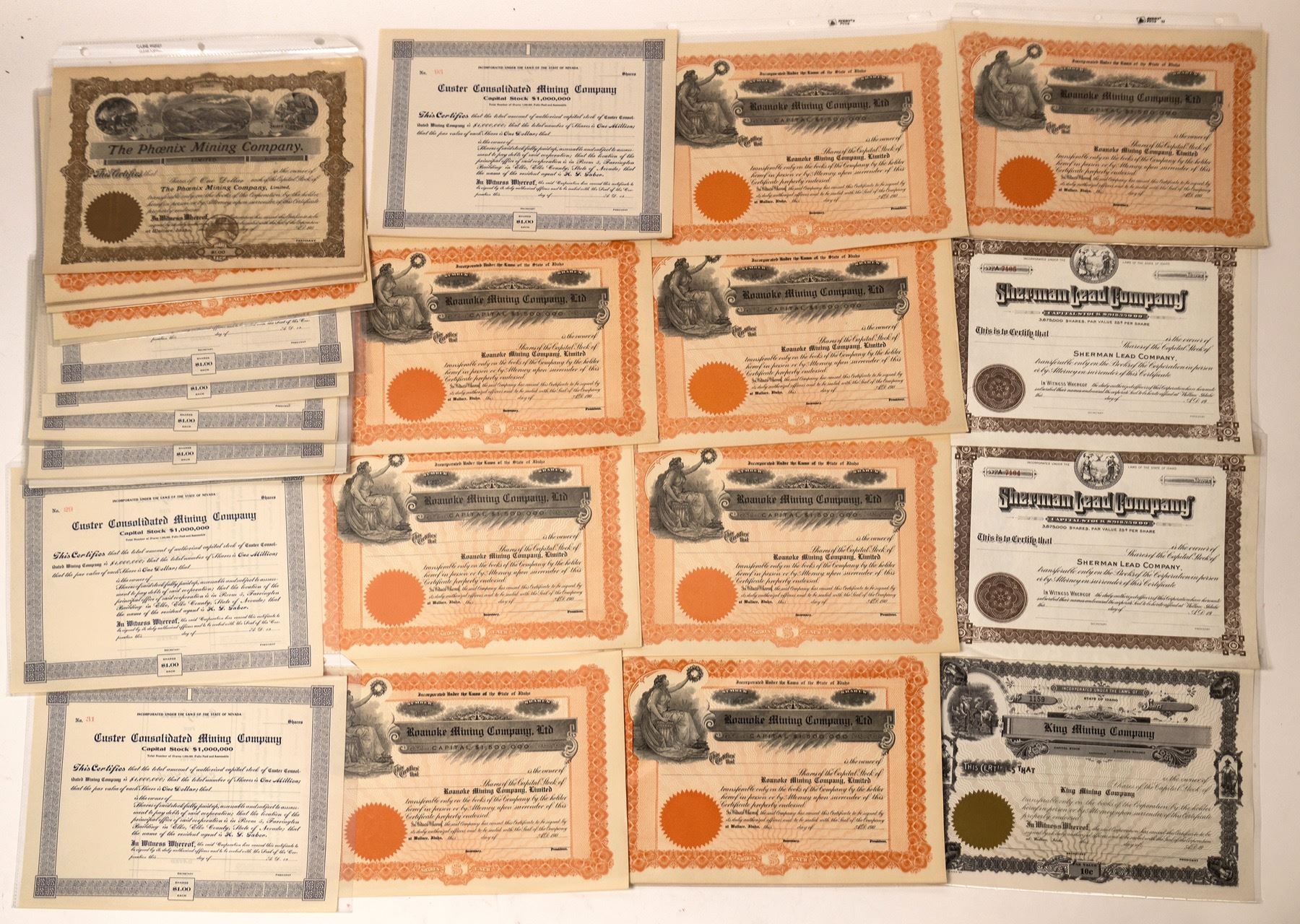 About 75 unissued Idaho mining stocks with duplicates. Sherman Lead, Roanoke, Custer Cons, King, Ambergris Cons, Phoenix Mining.
