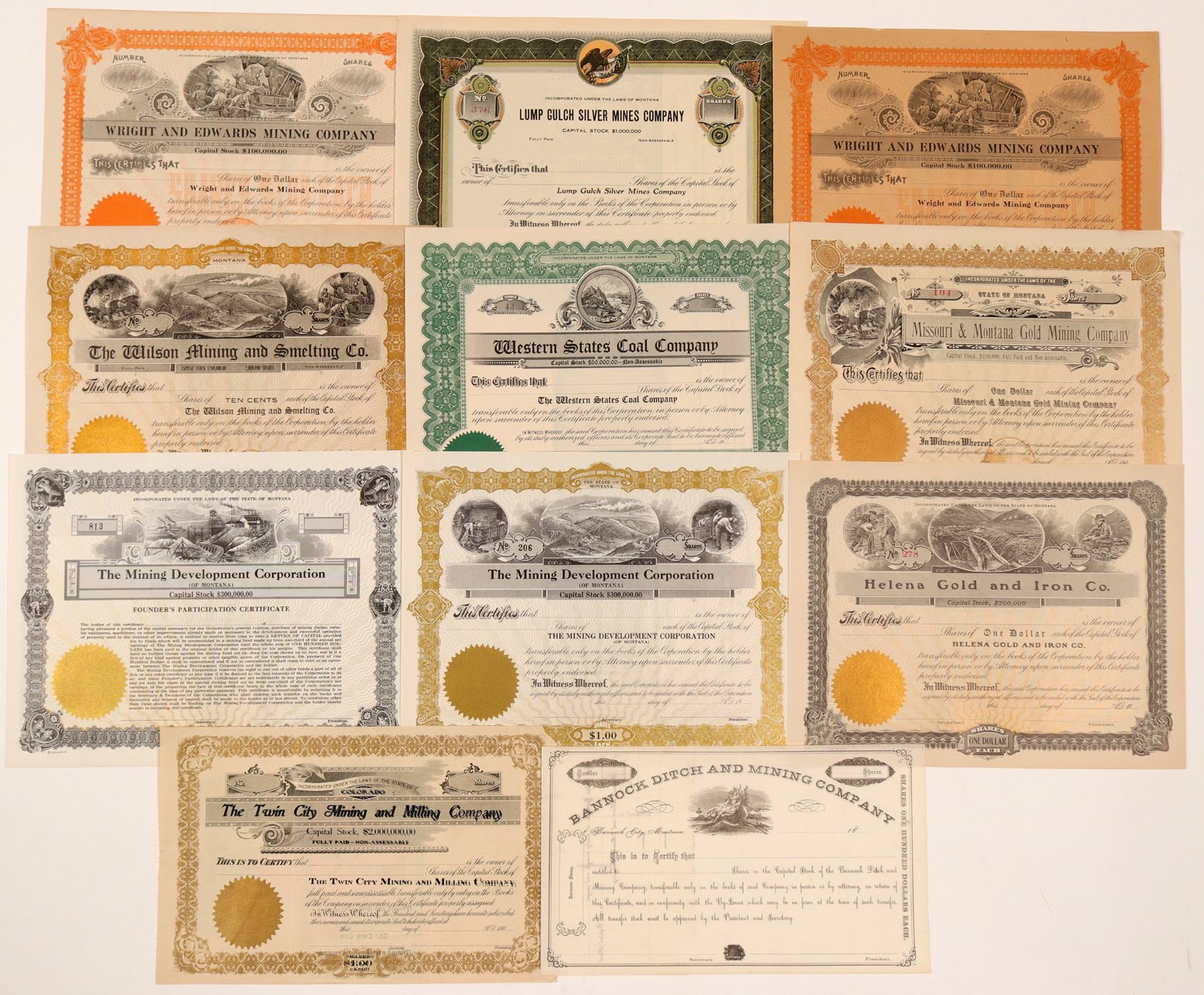 Lot of 11, most different. Not the usual stuff. Included: Twin City Mining & Milling Co.; Wright & Edwards MC (x2); Helena Gold & Iron Co.; The Mining Development Corp. (two diff); Missouri & Montana GMC; Western States' Coal Co.; Wilson Mining & Smelting Co.; Lump Gulch Silver Mines Co.; and Bannock Ditch & Mining Company. Many pictorial. Fair to very good condition. Please inspect. Ken Prag Collection