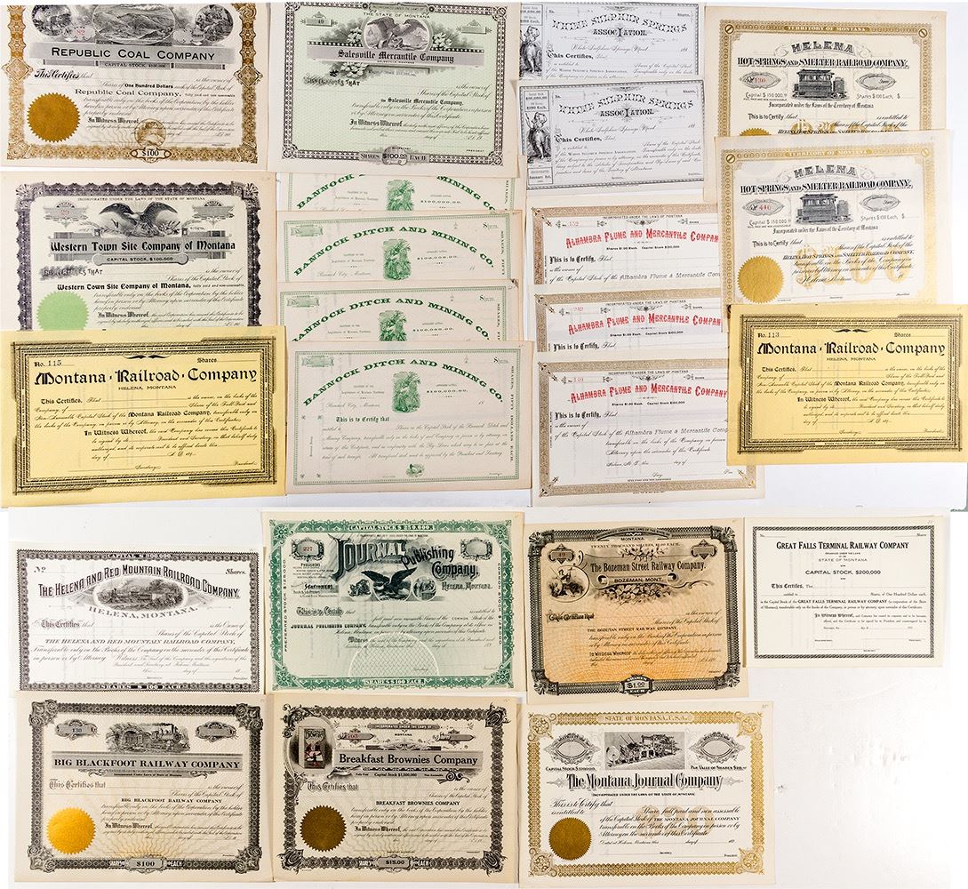Lot of 23, mostly railroad and non-mining, with a few mining. Most pictorial. Includes: Helena Hot Springs & Smelter Railroad Co. (two gorgeous), Montana Railroad Co. (two 189-), Bozeman Street Railway Co. (189-), Big Blackfoot Railway Co. (19--), Helena and Red Mountain Railroad Co. (18--), Great Falls Terminal Railway Co. (191-), Western Town Site Co. of Montana (190-), White Sulphur Springs Assoc. (two 188-), Breakfast Brownies Co. (19--), Republic Coal Co. (190-), Bannock Ditch & Mining Co. (4, 18--), Alhambra Flume & Mercantile Co. (three 188-), Salesville Mercantile Co. (19--), Journal Publishing Co. (189-), and The Montana Journal Co. (189-). (Prag Collection) City: State: Montana Date: HWAC# 34478