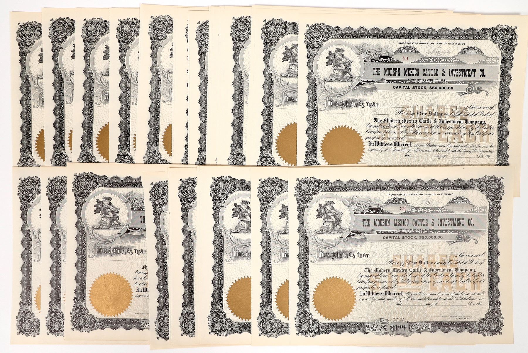 A group of approximately 54 unissued stock certificates from the Modern Mexico Cattle & Investment Company, dated 190X. Certificates no. 32 through 86 are included in the lot. All are in great condition.