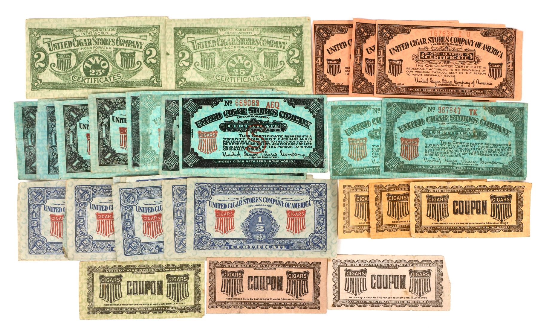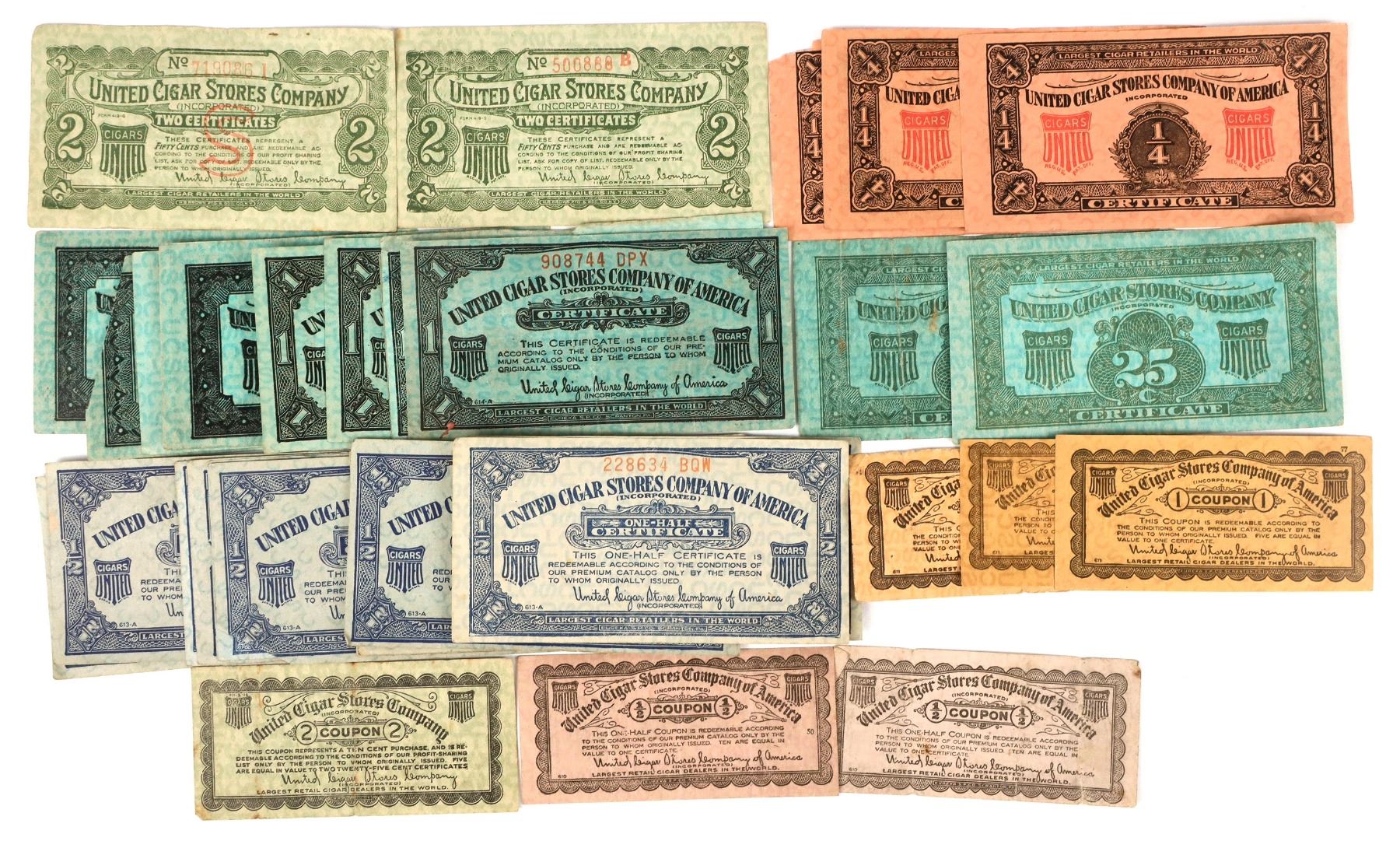 Thirty six pieces of scrip currency from the United Cigar Stores Company: one quarter, one half, one and two denominations; most are 4 1/2 x 2 1/2 inches; coupons are 3 x 2 inches.