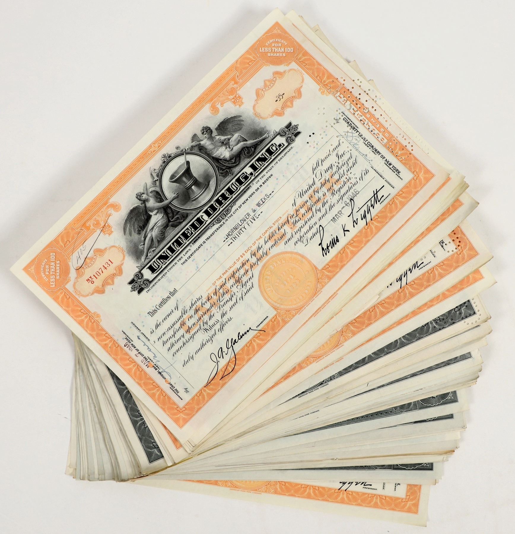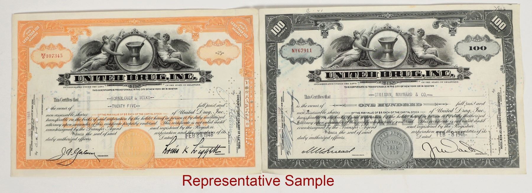 United Drug Inc. stocks group, approx. (100) certificates, (2) varieties, issued 1945-1946. See photos.