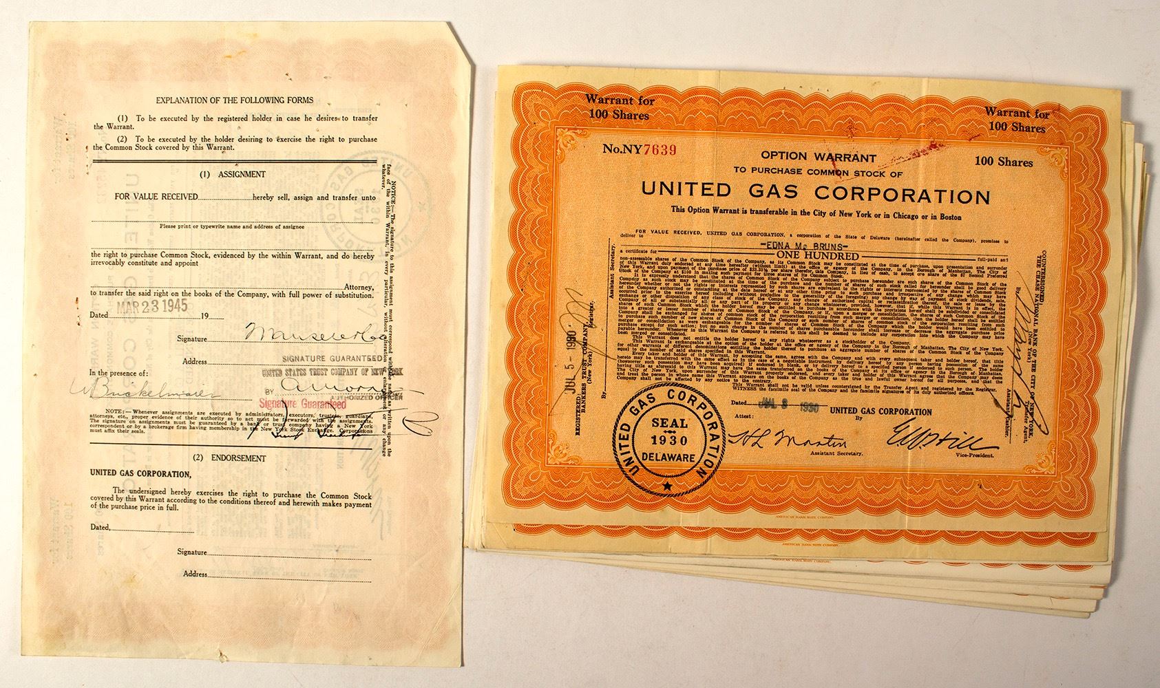 Twenty seven stock certificates, warrants for 100 shares, issued 1943-44. United Gas Corporation was a major oil company from its inception in 1930 to its hostile takeover and subsequent forced merger with Pennzoil in 1968. City: State: Date: HWAC # 48971