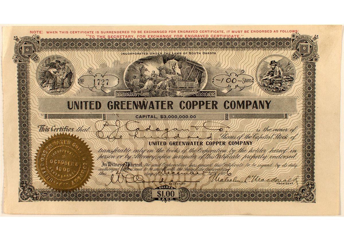 Cert. #1727, issued in 1906 to P.J. Cadagan & Co. for 100 shares. Signed by Malcolm Macdonald as president. Macdonald was president of the First National Bank of Tonopah and had extensive interest in Greenwater. Macdonald also represented Charles Schwab in California and Nevada and had ties to the Montgomery Shoshone and the Tonopah Extension mines. The United Greenwater Copper Co. was consolidated with the Greenwater and Death Valley by Macdonald to form Schwab's $25 million Greenwater Copper Mines and Smelter Company (George Graham Rice, My Adventures With Your Money). Uncancelled. This certificate was slated to be swapped for an engraved certificate, but that likely never happened.City: GreenwaterCounty: InyoState: CADate: