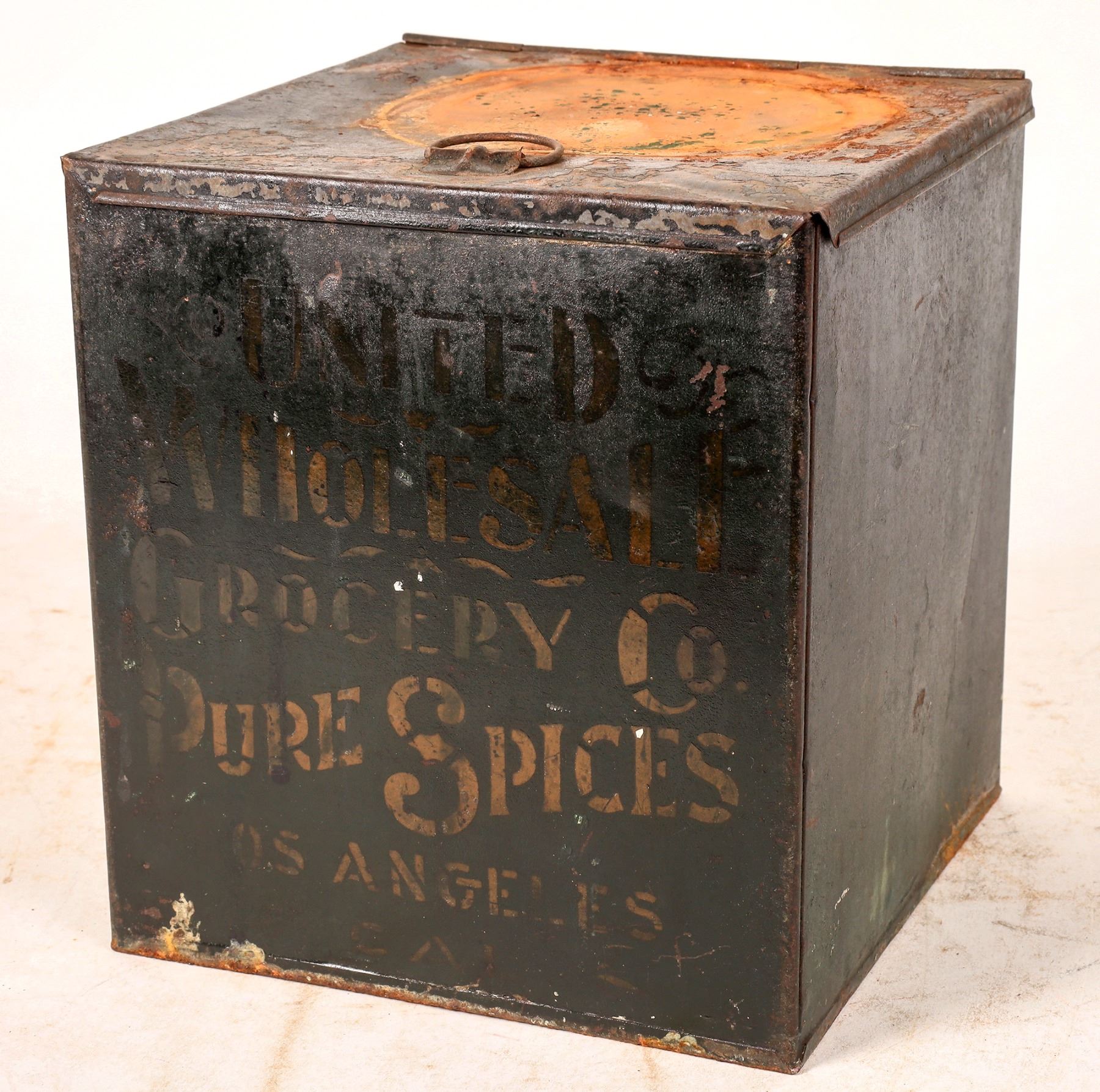 c. late 1800's United Grocery, Pure Spices, Los Angeles, Cal. spice tin. 7.75", some rust, mostly on lid. California Los Angeles Gary Bracken Collection