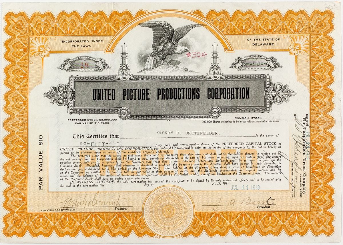Inc. in Delaware. No. 48, issued for 50 shares to Henry C. Bretzfelder on July 11, 1919. Signed by J.A. Berst (president) and the treasurer. Orange border and eagle vignette. Not cancelled. Staple holes and folds. (Prag Collection) City: State: Date: 1919 ID# 31356