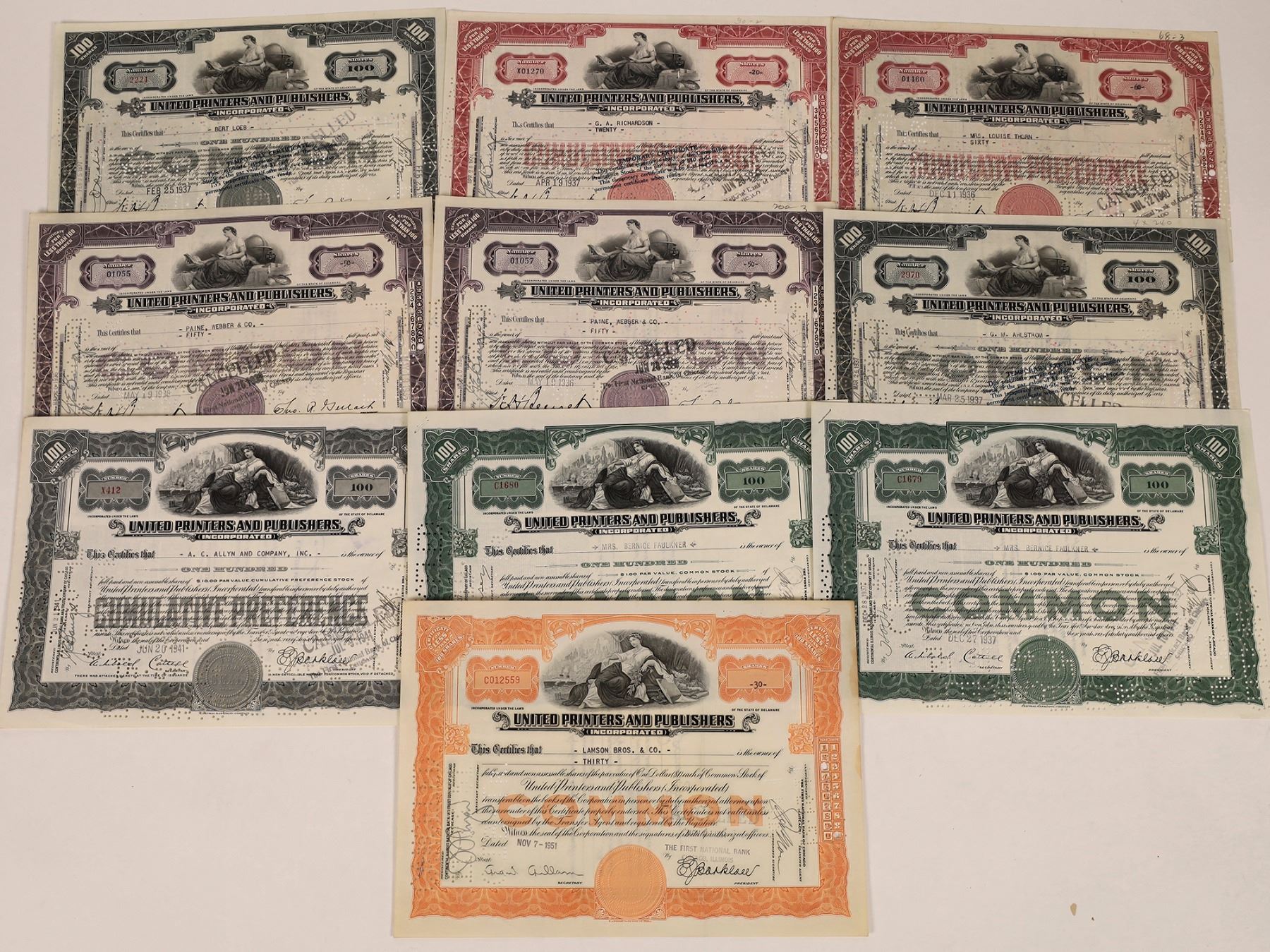 Lot of 10, a few varieties. Issued 1936-1951, punch cancelled. All feature the same general design, but different border colors and sizes. ABN.