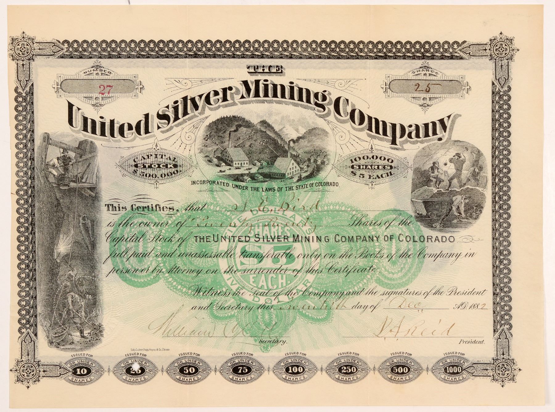 Inc. in Colorado. No. 27, issued for 25 shares to SE Bird on Dec. 20th, 1882. Signed by president JA Reid and the secretary (illegible). Not cancelled. Very attractive design with black border and print, three different mining vignettes, and green RN facsimile underprint. Printed by Culver, Page, Hayne & Co., Chicago. Folds, light wear, left border uneven. 8 x 10.75" Not listed in C&L or on CHNC. The only reference we could find was in E&MJ Vol. 35, 1883, which stated the company's operations were in Saguache County, Colorado with an office in Chicago. Ken Prag Collection