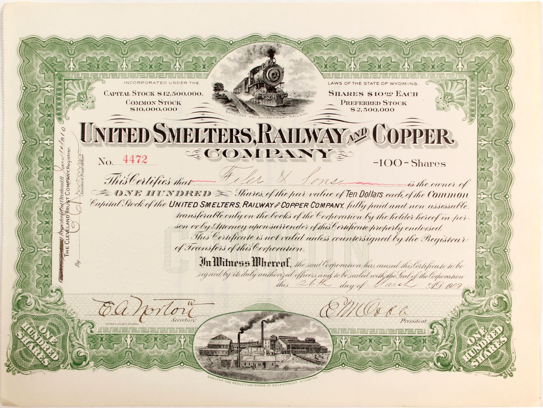 I/U #4472 Filer and Sons 100 shares 1909 signed by President McCabe. Operated a 16 mile automatic Tramway from the Ferris Haggerty Copper mine to the smelting/reduction works at Encampment. Locomotive and smelter vignettes. Prag Collection