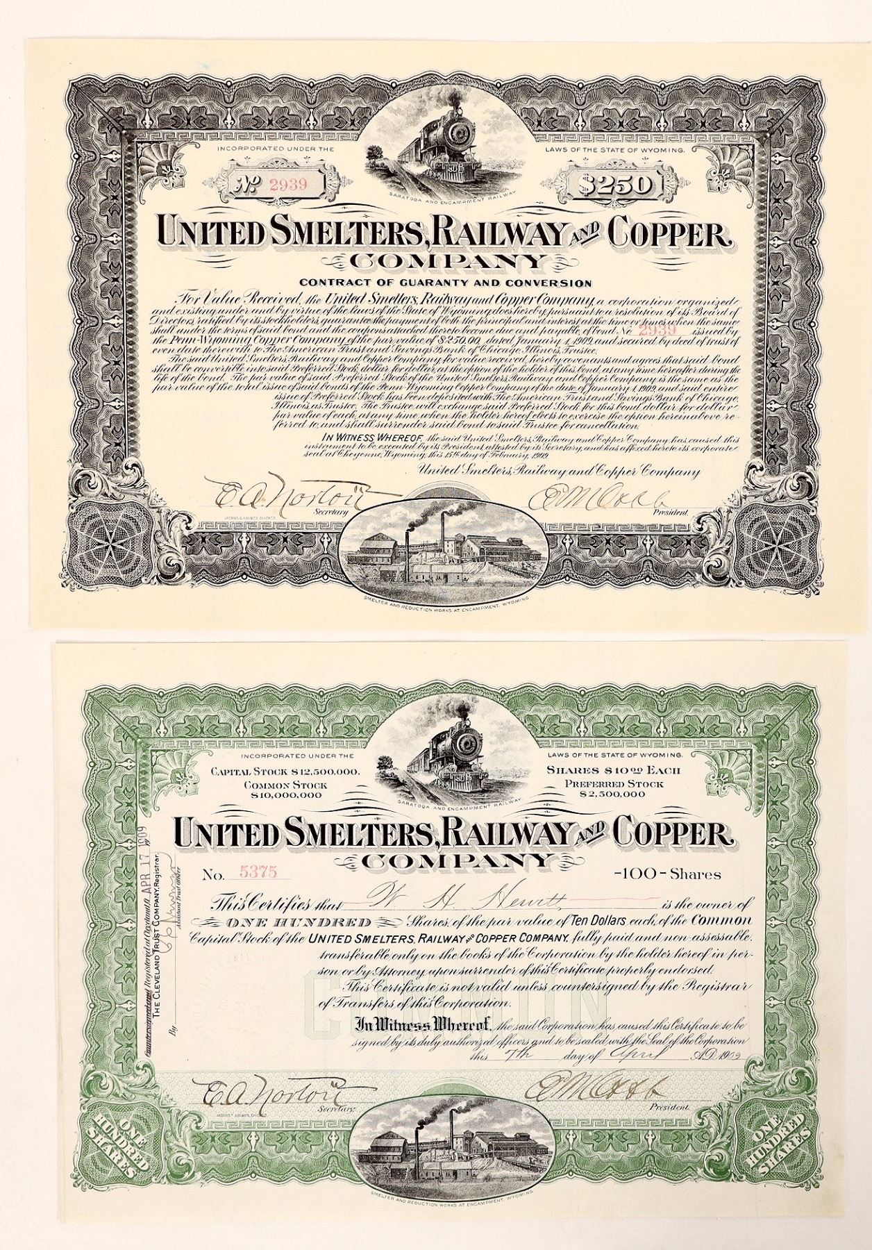 Stock and guaranty certificate (2) issued by United Smelters, Railway and Copper. The contract of guaranty was issued in February 1909, while the stock was issued in April of that year. The vignettes on both are the same steam locomotive, while both bottom vignettes show the smelter. Please see photos for more details.[ Wyoming
