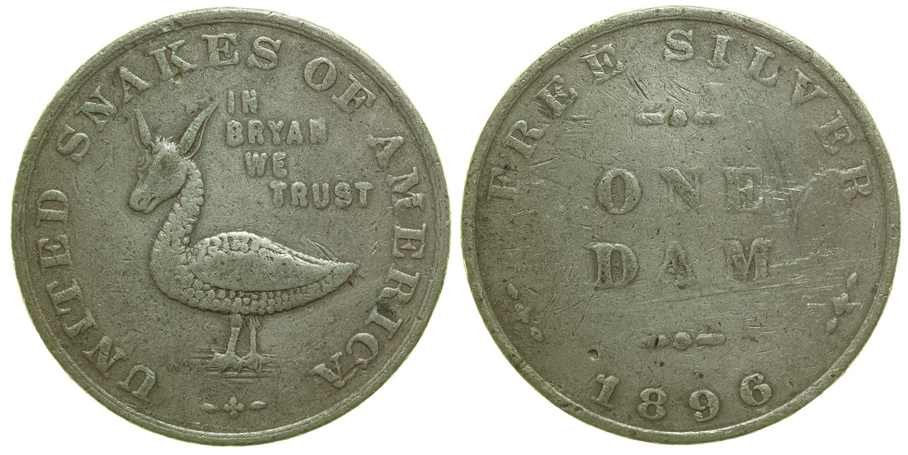 Obv.: United Snakes of America / In Bryan We Trust; Rev.: Free Silver / One / Dam / 1896. White metal, 45mm. Sch. - 353, Zerbe -53. The image on the obverse is a goose/donkey hybrid. City: State: Date: 1896 HWAC# 51854