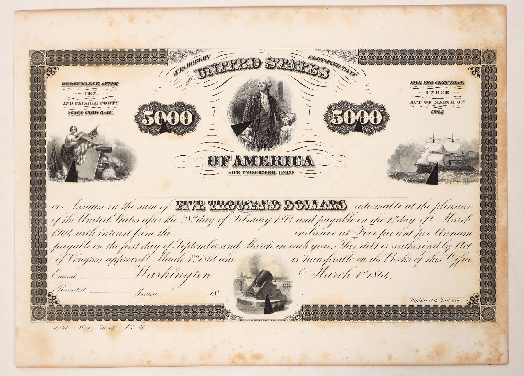 1864 United States $5000 bond on heavy stock from counterfeit detector book Foxing, please inspect.